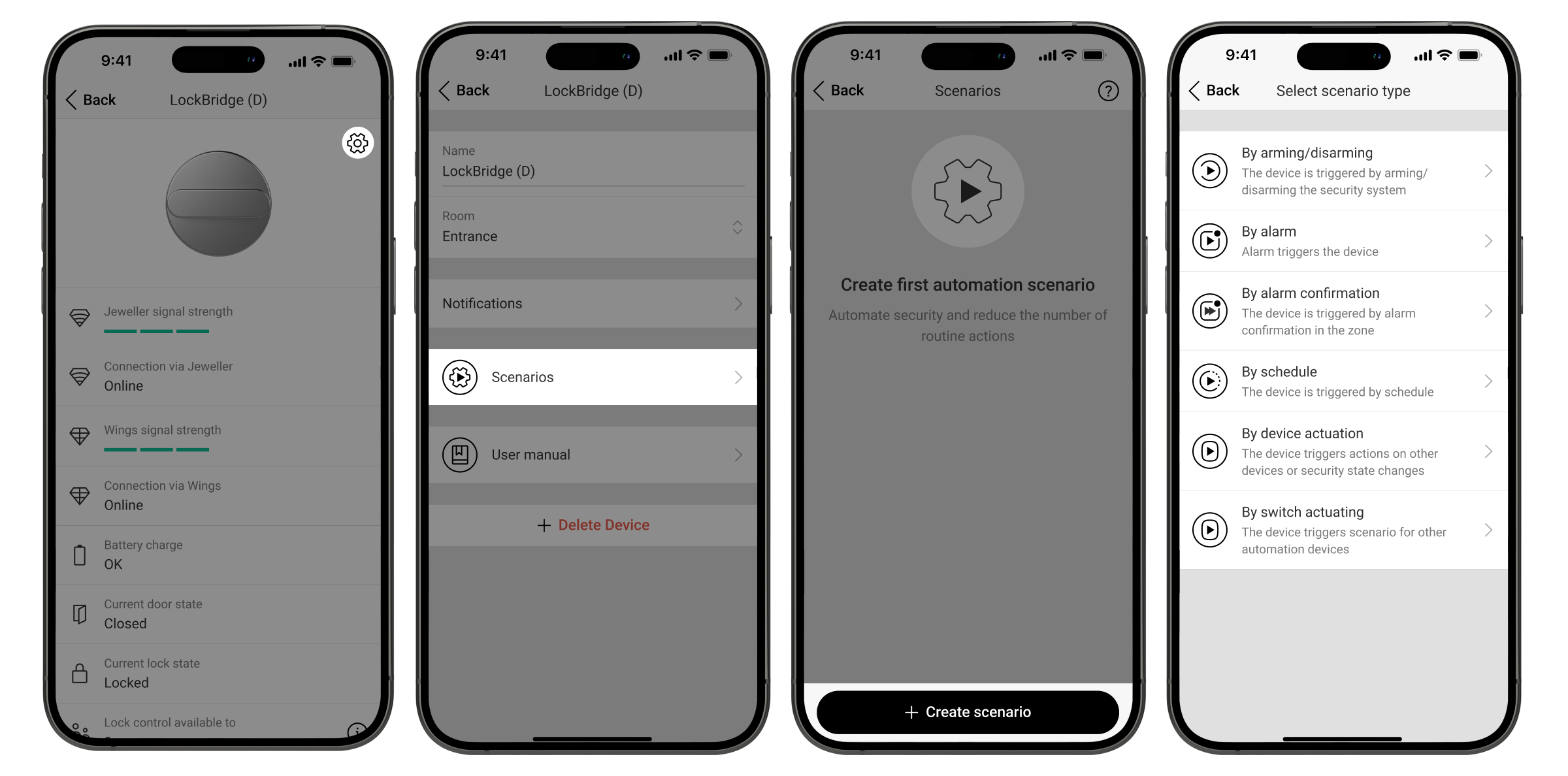 - Durch Betätigung des Geräts. Zum Beispiel, schalten Sie den Space scharf, wenn die Tür verschlossen ist. Die Unterstützung für die Auslösung anderer Automatisierungsgeräte wird später hinzugefügt.