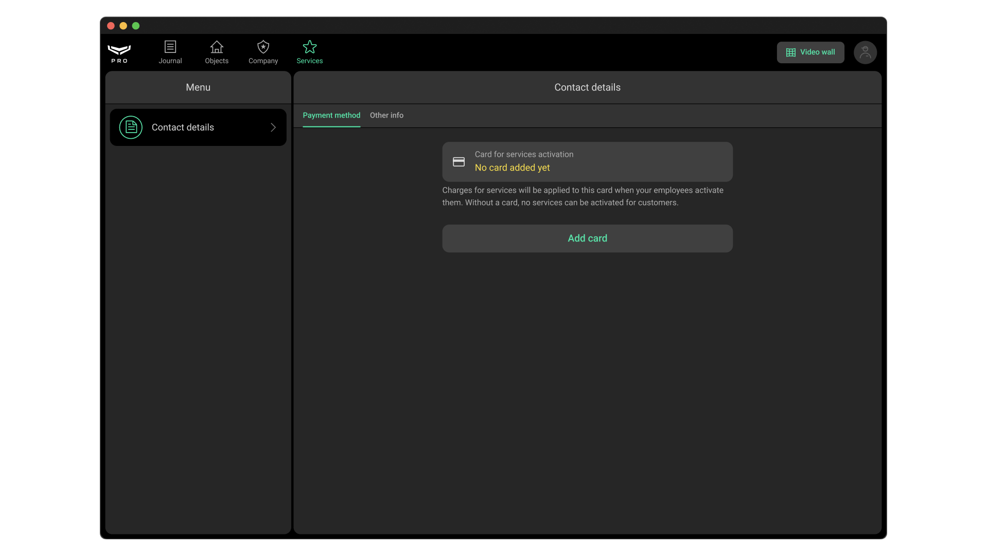 Company owner or Senior Ajax services manager must add a payment card to be used for billing. To do this in Ajax PRO Desktop: