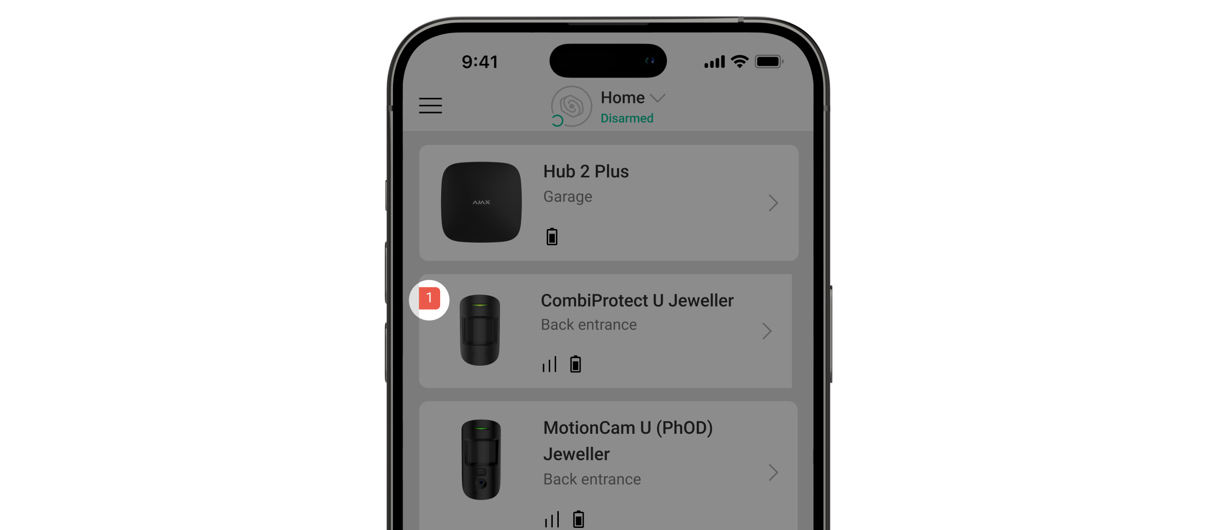 | CombiProtect U Jeweller has detected motion. The icon is displayed when the detector is armed. | |