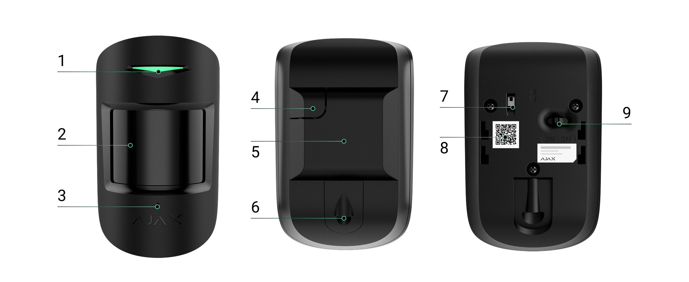 - QR code with the device ID. It is used to pair the device with an Ajax hub.