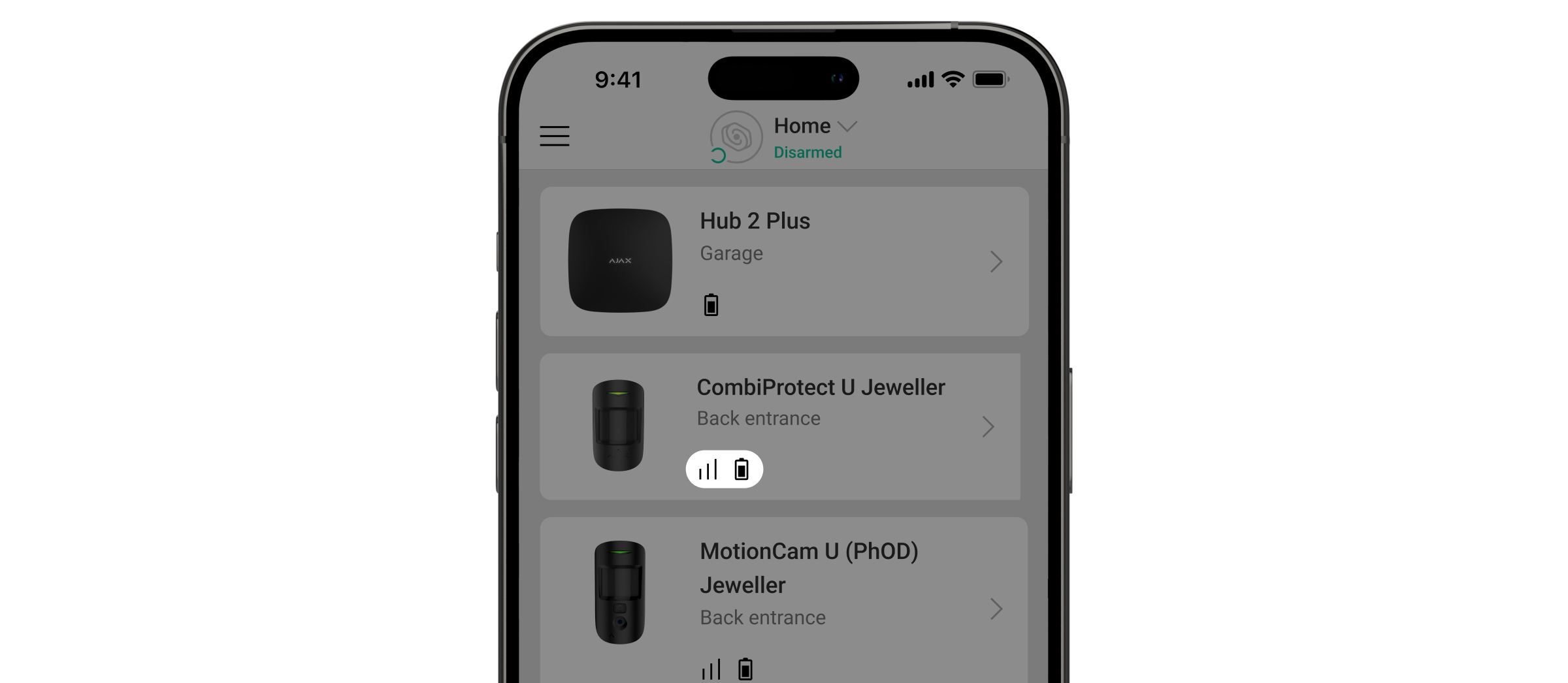 The Jeweller signal strength is determined by the number of undelivered or corrupted data packages over a certain period. The icon on the Devices