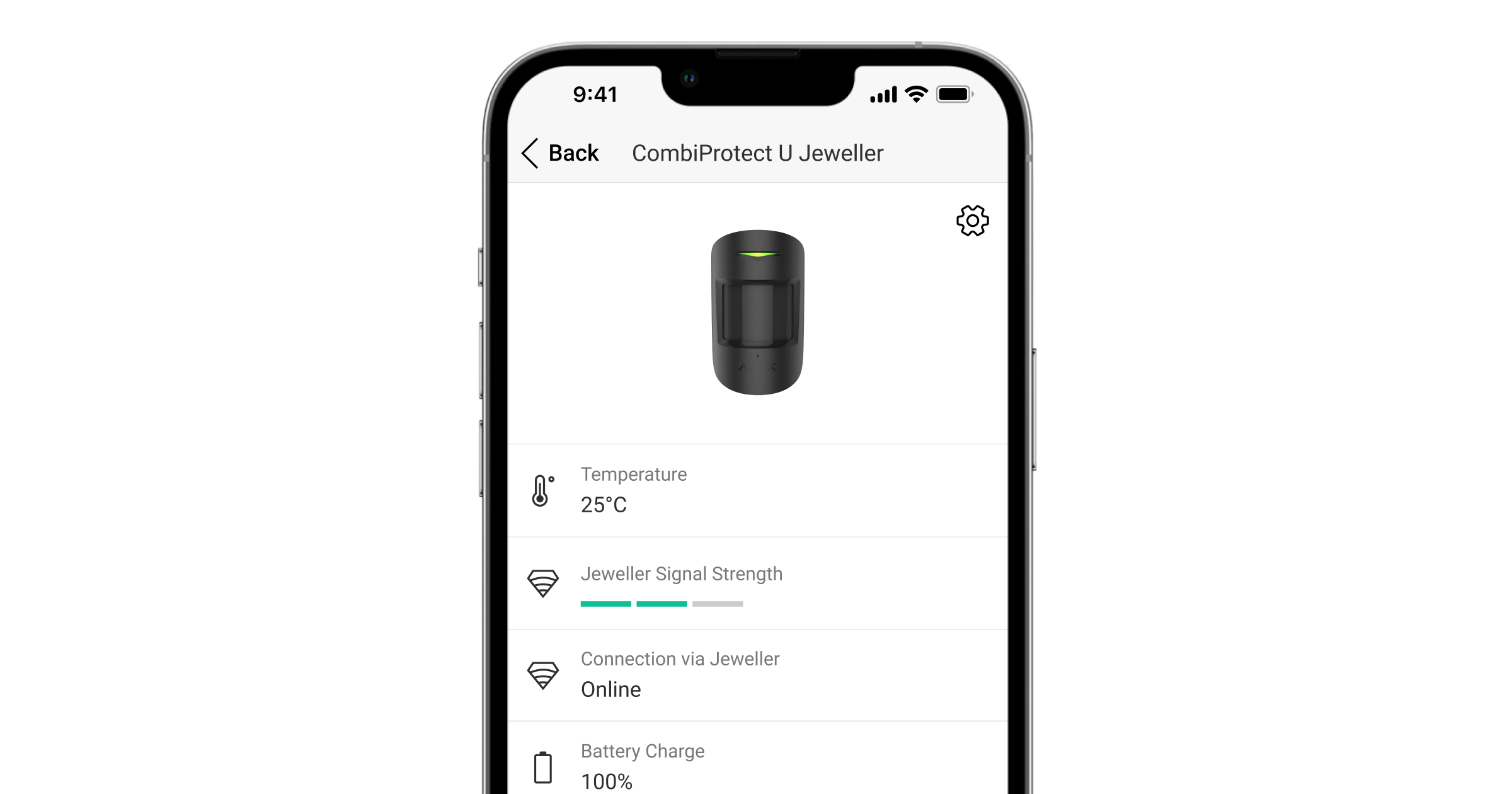 CombiProtect U Jeweller operates within the Ajax system, connected to a hub via the protected Jeweller protocol. The communication range in an open space is up to 1,200 meters. CombiProtect U Jeweller operates for up to 5 years from a pre-installed battery. The device is designed for indoor use only.