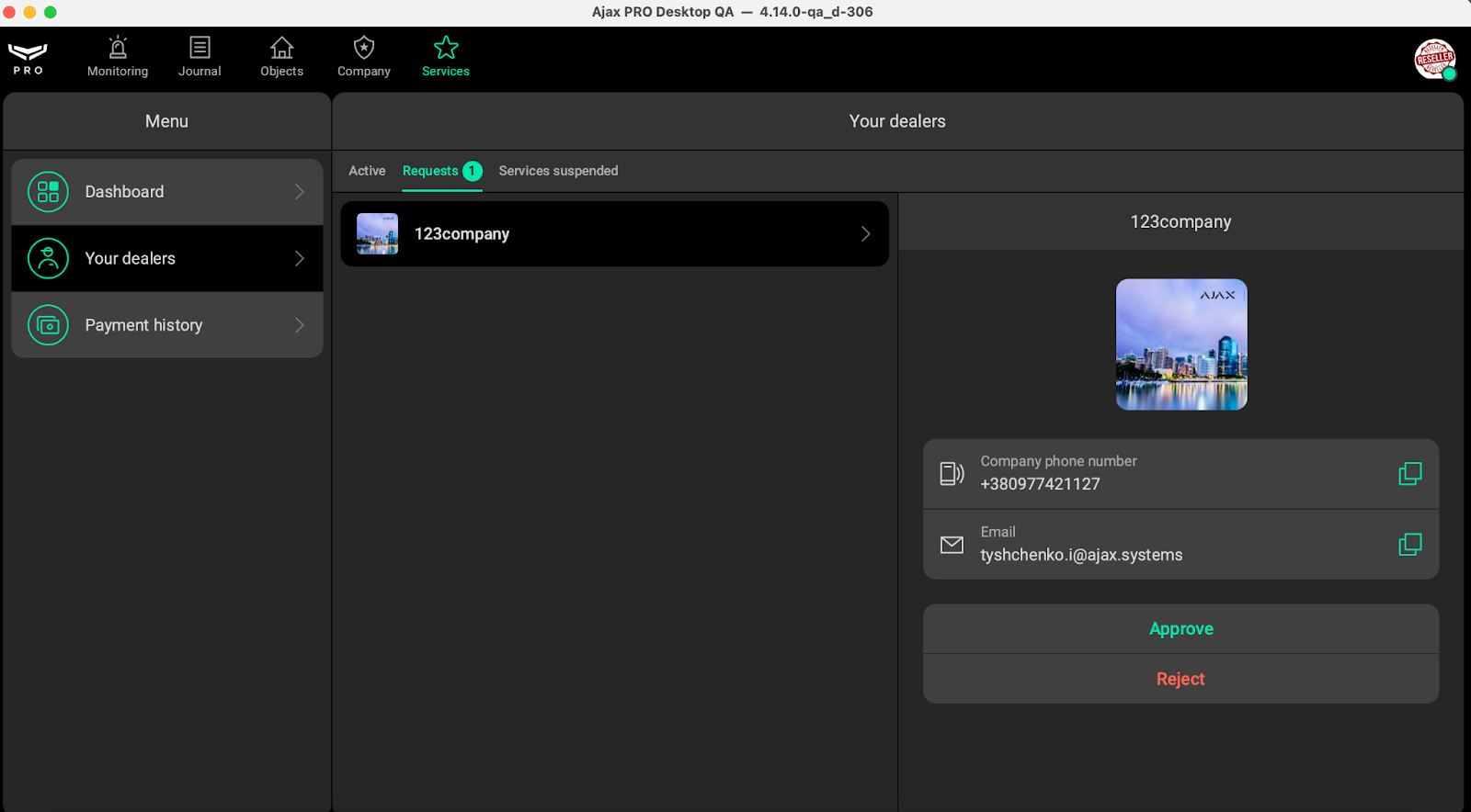 Before Ajax Services can be activated, the Reseller company must first approve the Dealer’s connection request: