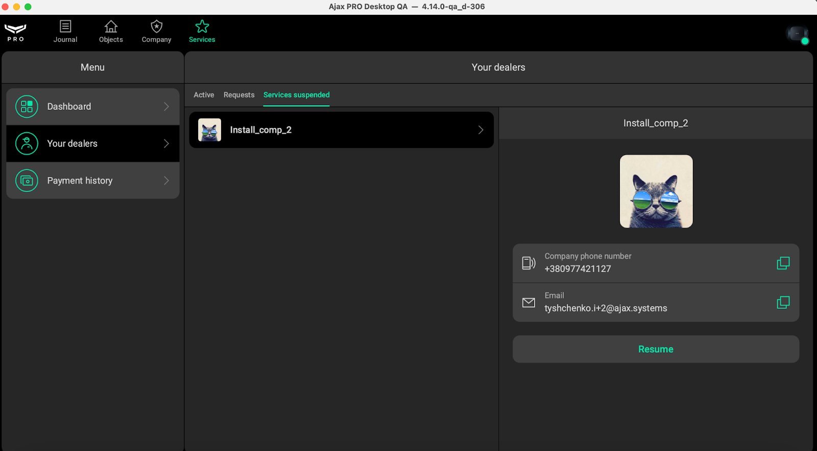 The Reseller can resume the Services for a Dealer anytime by clicking Resume. Such connection will reappear in the Active section.