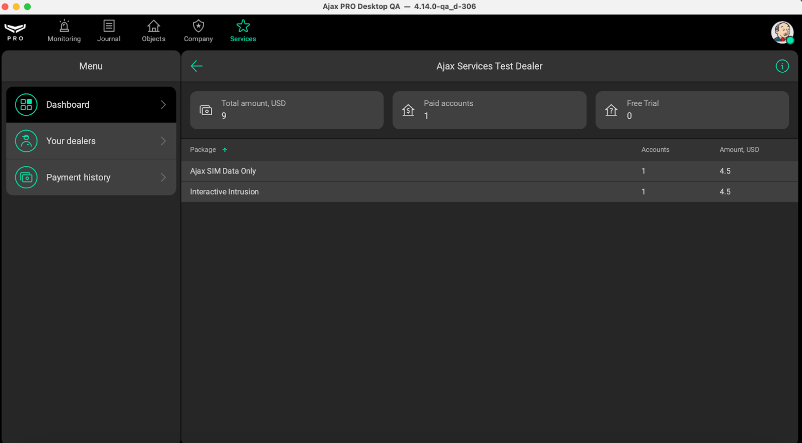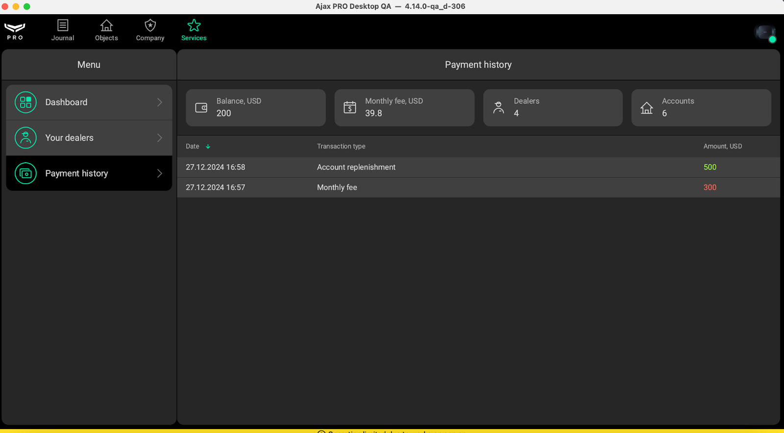The Payment history tab shows the Reseller company’s current account balance, the total monthly fee, the number of Dealers who have activated Ajax Services, and the number of accounts with active Services.