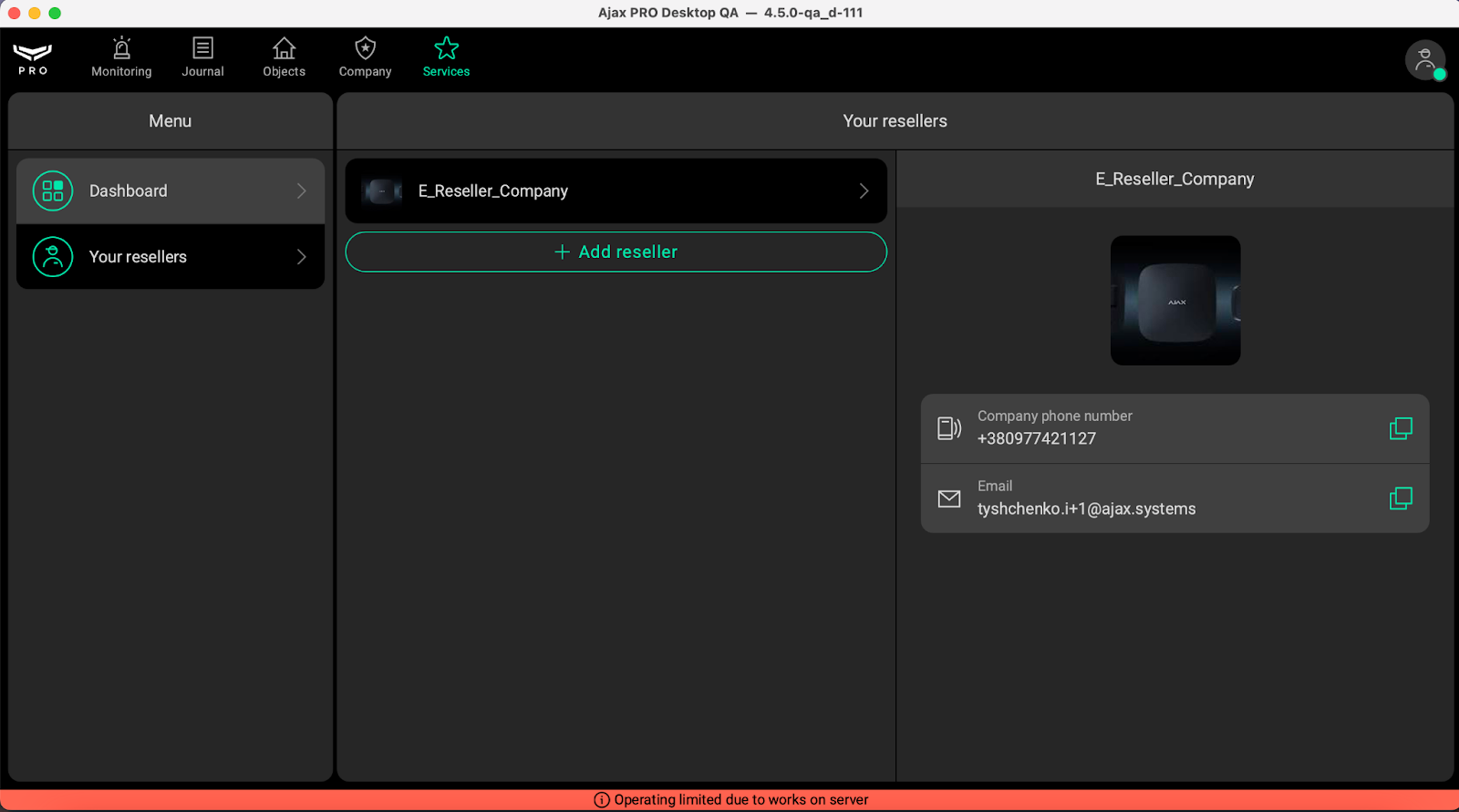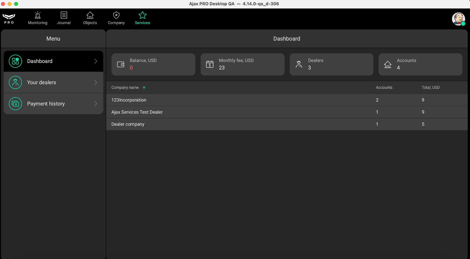 The Dashboard provides an overview of the Reseller’s company account. It displays the current balance, the monthly fee payable to Ajax, the number of Dealers who have activated Ajax Services, and the number of accounts with active Services. Below, the Reseller can also see a breakdown of each Dealer’s activity, including how many accounts have Services enabled and the total monthly fee for each account.