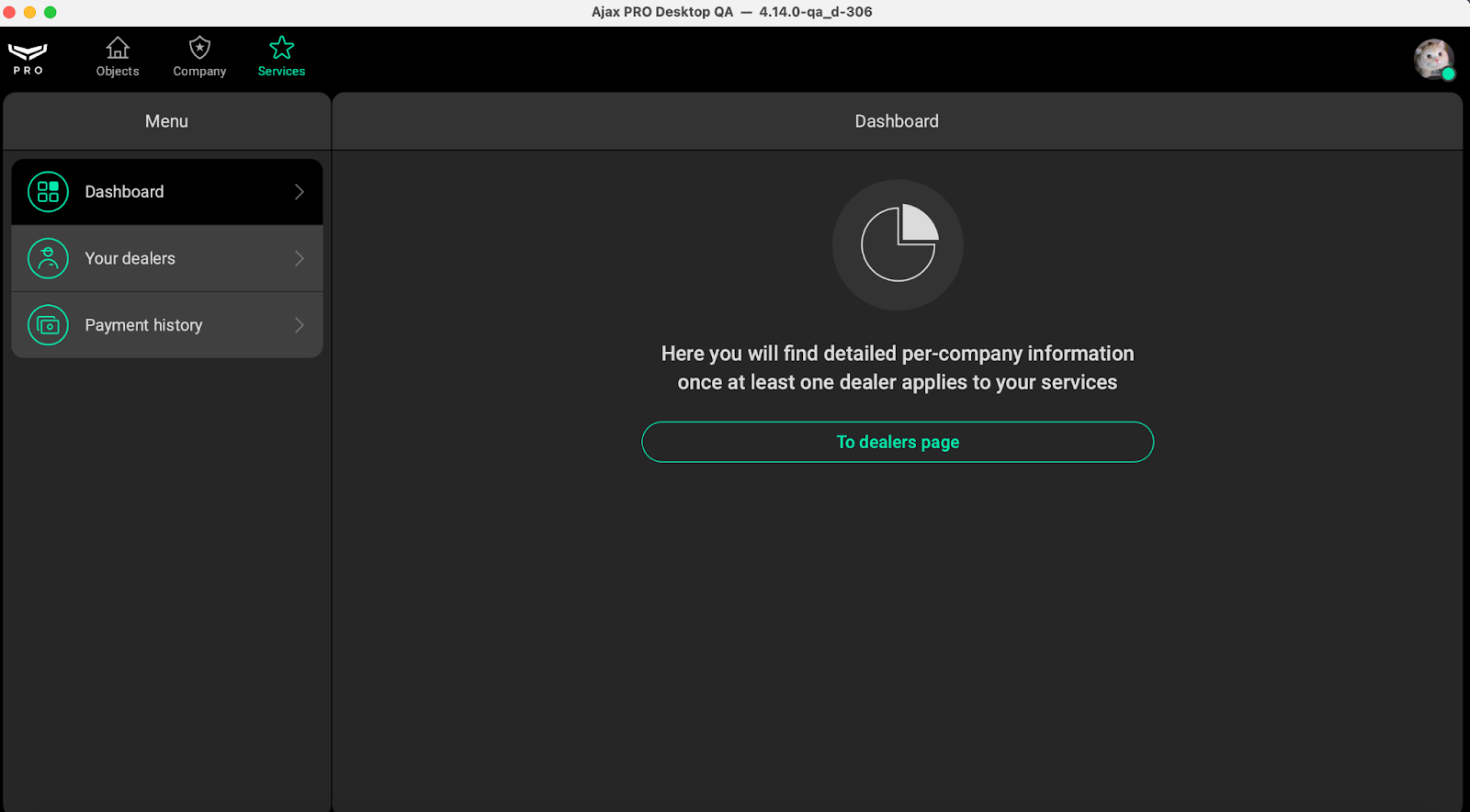If no Dealer has activated Ajax Services through this Reseller, an empty state screen with is shown in the Dashboard. It informs the Reseller that detailed information will be available once at least one Dealer applies.