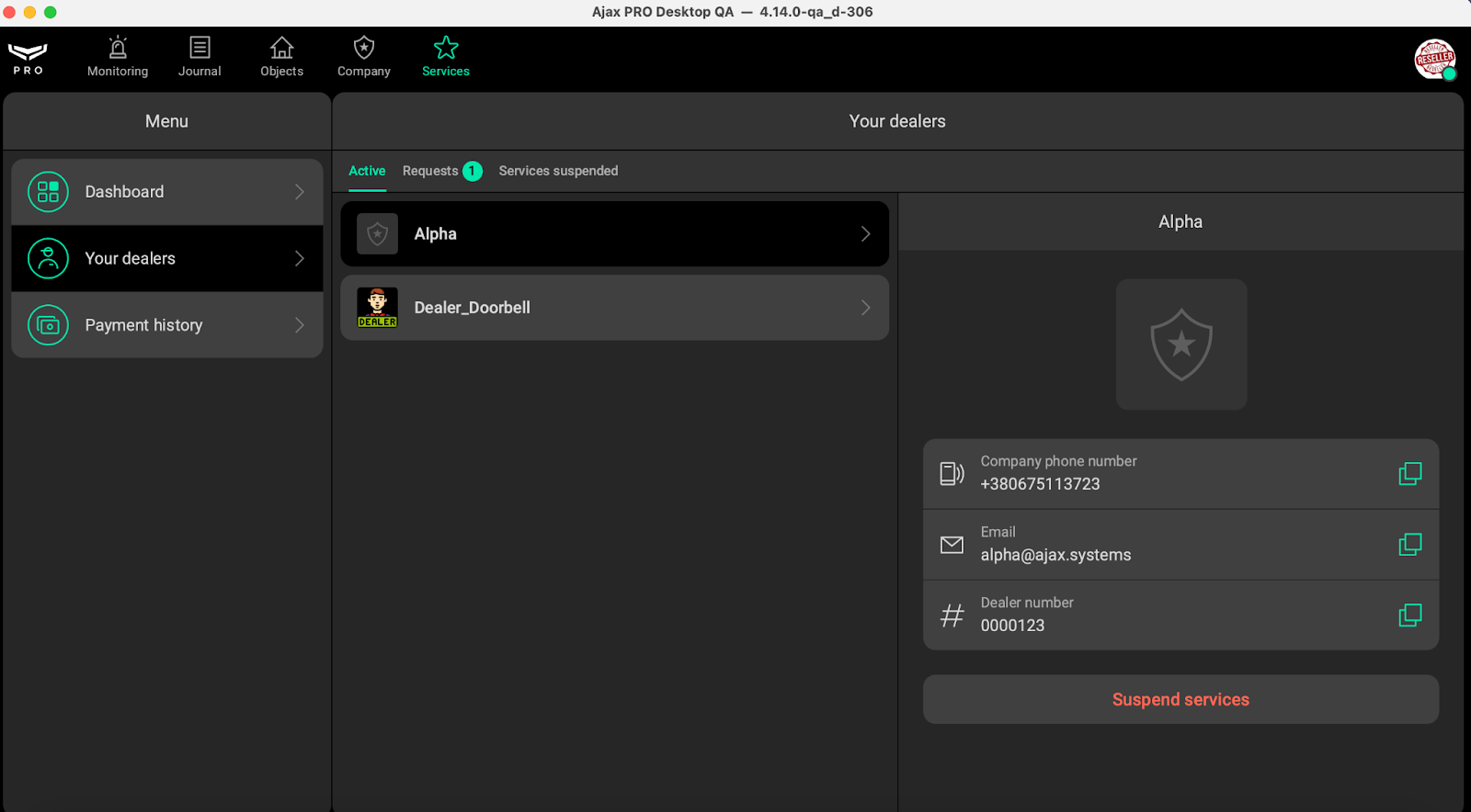 The Services suspended section shows Dealers whose service connections have been suspended by the Reseller. These Dealers cannot activate new Services from this Reseller.