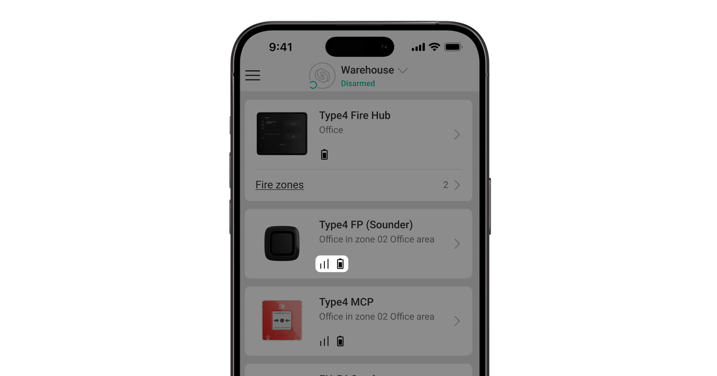 When an Type4 FireProtect (Sounder) Jeweller fault is detected, an Ajax app displays a fault counter on the device icon. All faults are indicated in the device states. Fields with faults are highlighted in yellow. Also, faults are displayed in the Control tab of the Type4 Fire Hub Jeweller display. More details about the fault can be found in the Event center or Fire zones tabs of Type4 Fire Hub Jeweller.