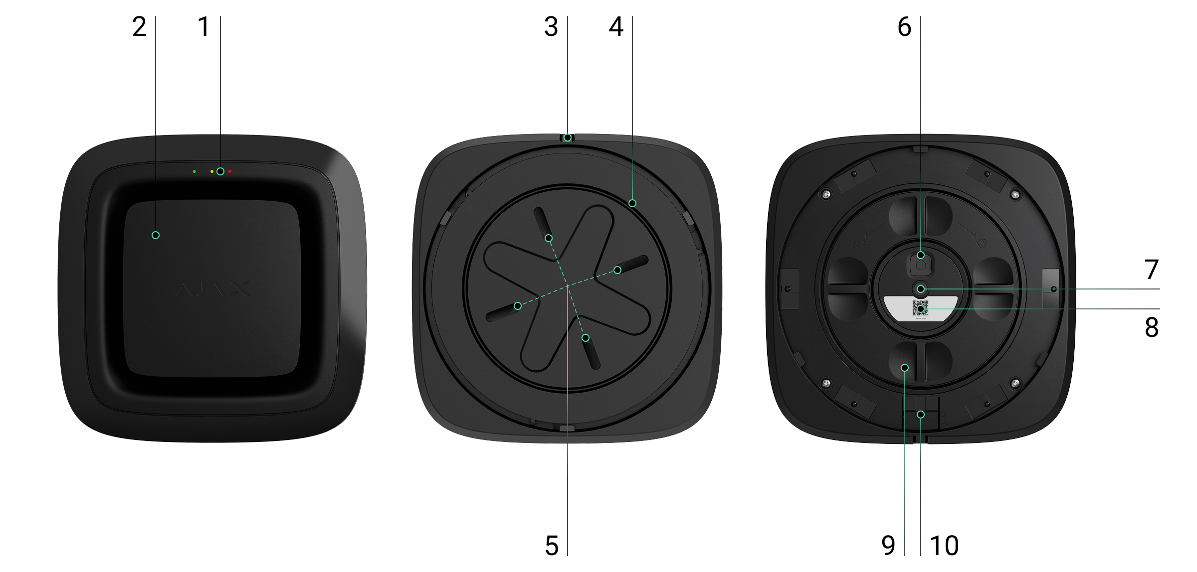 - Tamper button. It triggers in case of an attempt to remove the device from the mounting panel.