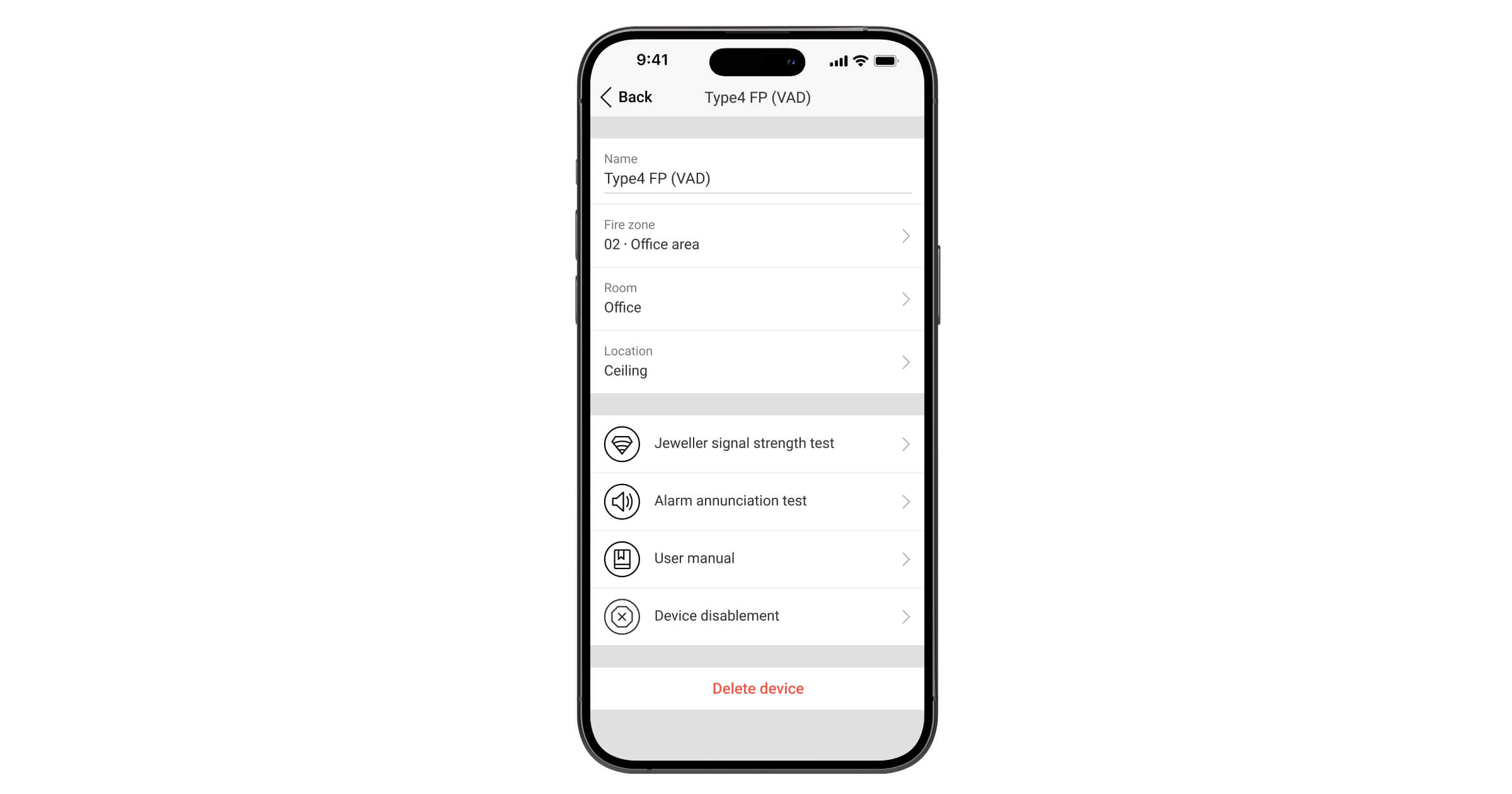 | Delete device | Unpairing the device, disconnecting it from the fire alarm central unit, and deleting its settings. |