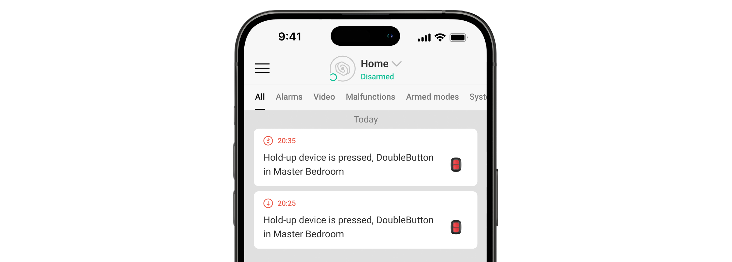 Todas las alarmas del Superior DoubleButton G3 Jeweller se registran en el historial de eventos de la app Ajax. Las pulsaciones cortas y largas se muestran con iconos diferentes, pero el código de evento transmitido a la CRA y el texto para SMS y notificaciones push son los mismos independientemente del tipo de pulsación.