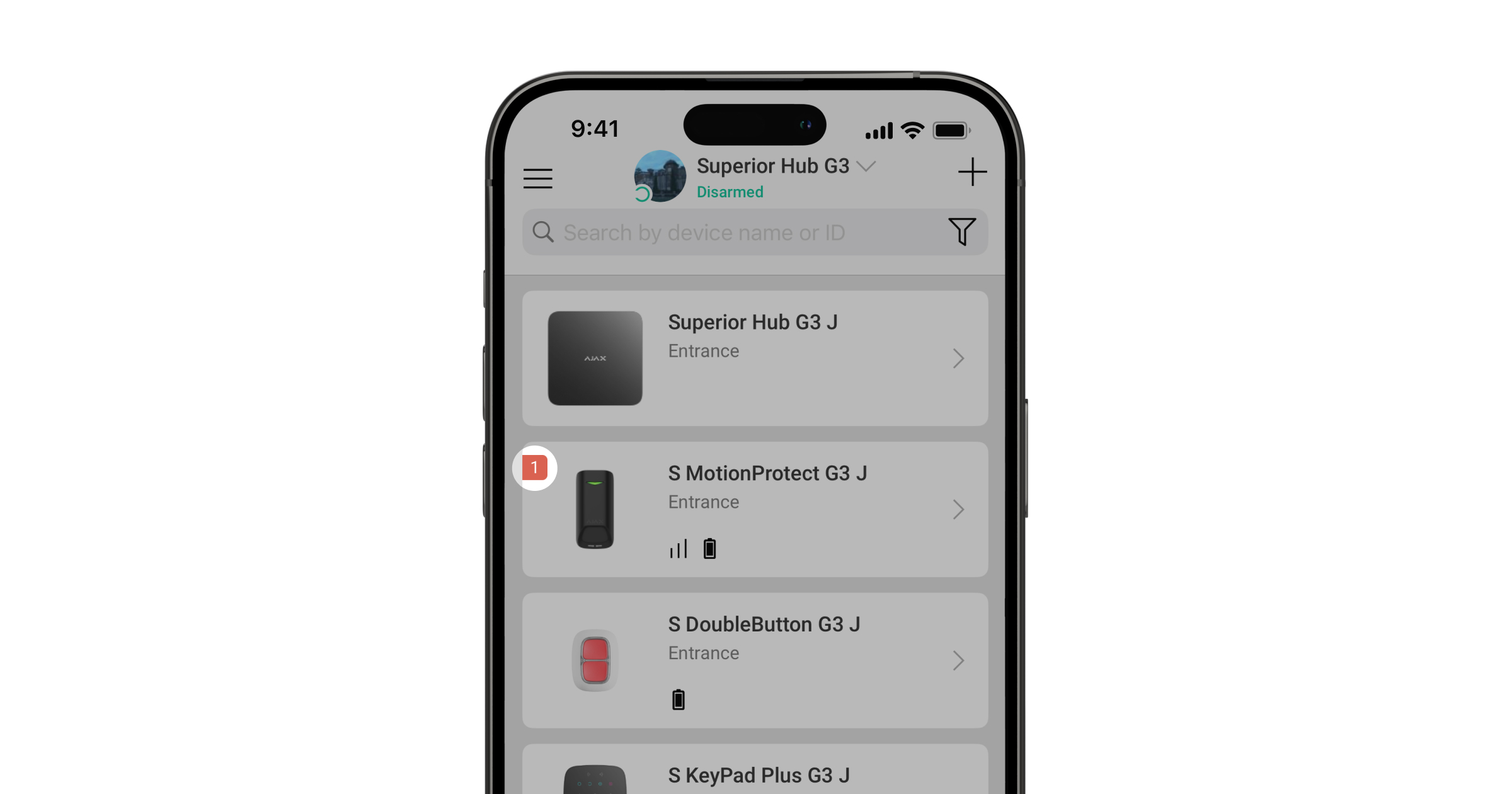Cuando el dispositivo detecta un fallo de funcionamiento (por ejemplo, se ha perdido la conexión a través del protocolo Jeweller), se muestra un contador de fallos de funcionamiento en la app Ajax, en la esquina superior izquierda del icono del dispositivo.