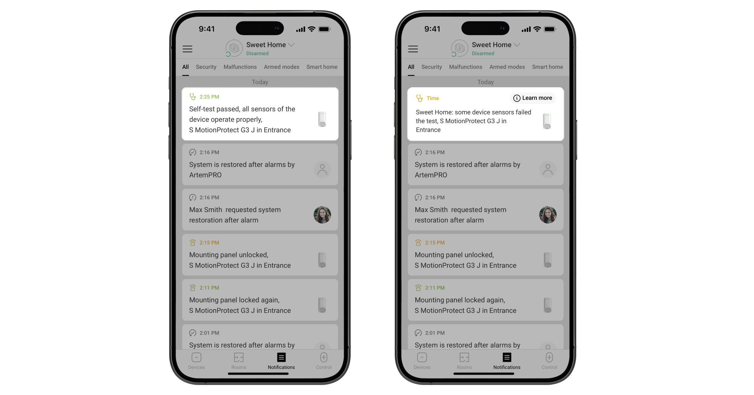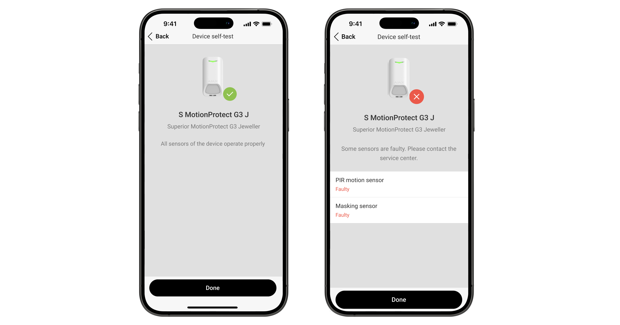 Si se desactiva un sensor defectuoso, el sistema no mostrará el contador de fallos de funcionamiento en una app Ajax y no notificará a los usuarios sobre el fallo en el funcionamiento del sensor. Sin embargo, si un usuario activa un sensor defectuoso, el sistema enviará una notificación de que el sensor funciona mal.