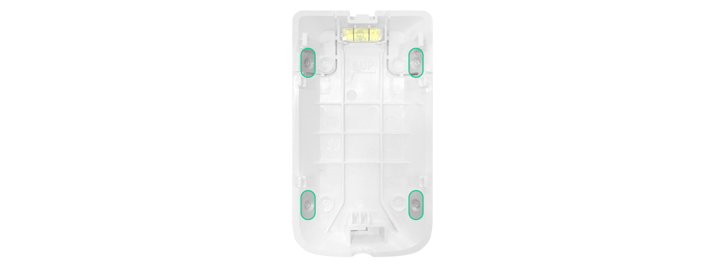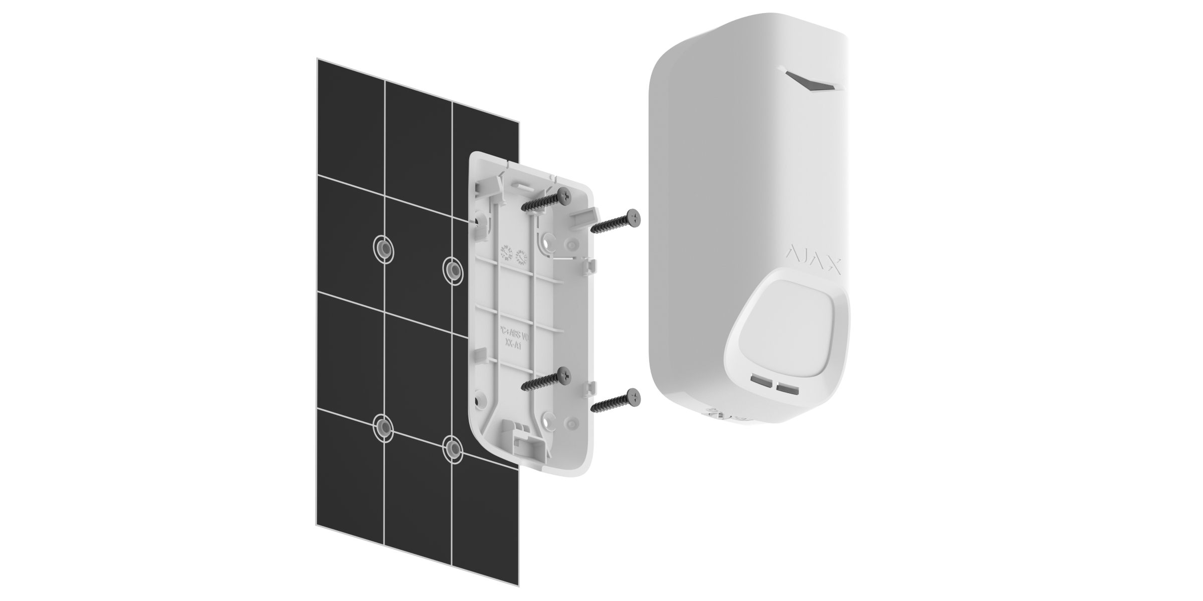 - Si el detector pasa los tests con éxito, fije el panel de montaje SmartBracket a una superficie vertical con los tornillos suministrados. Utilice al menos dos puntos de fijación (uno de ellos se encuentra en la pieza perforada del soporte, encima del interruptor antisabotaje). El interruptor antisabotaje reacciona si alguien intenta romper o abrir la tapa de la carcasa: la notificación correspondiente se enviará a las apps Ajax.