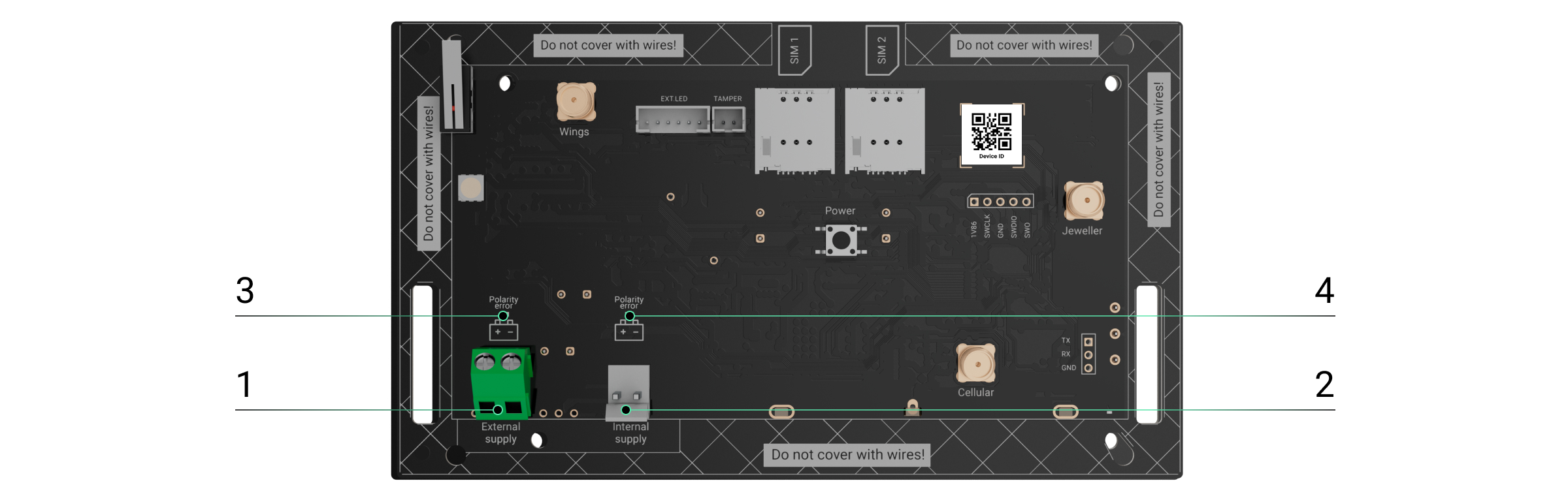 - Connecteur pour fixer une LED externe à la centrale. La LED externe est incluse dans le kit complet Hub BP Jeweller (without casing).