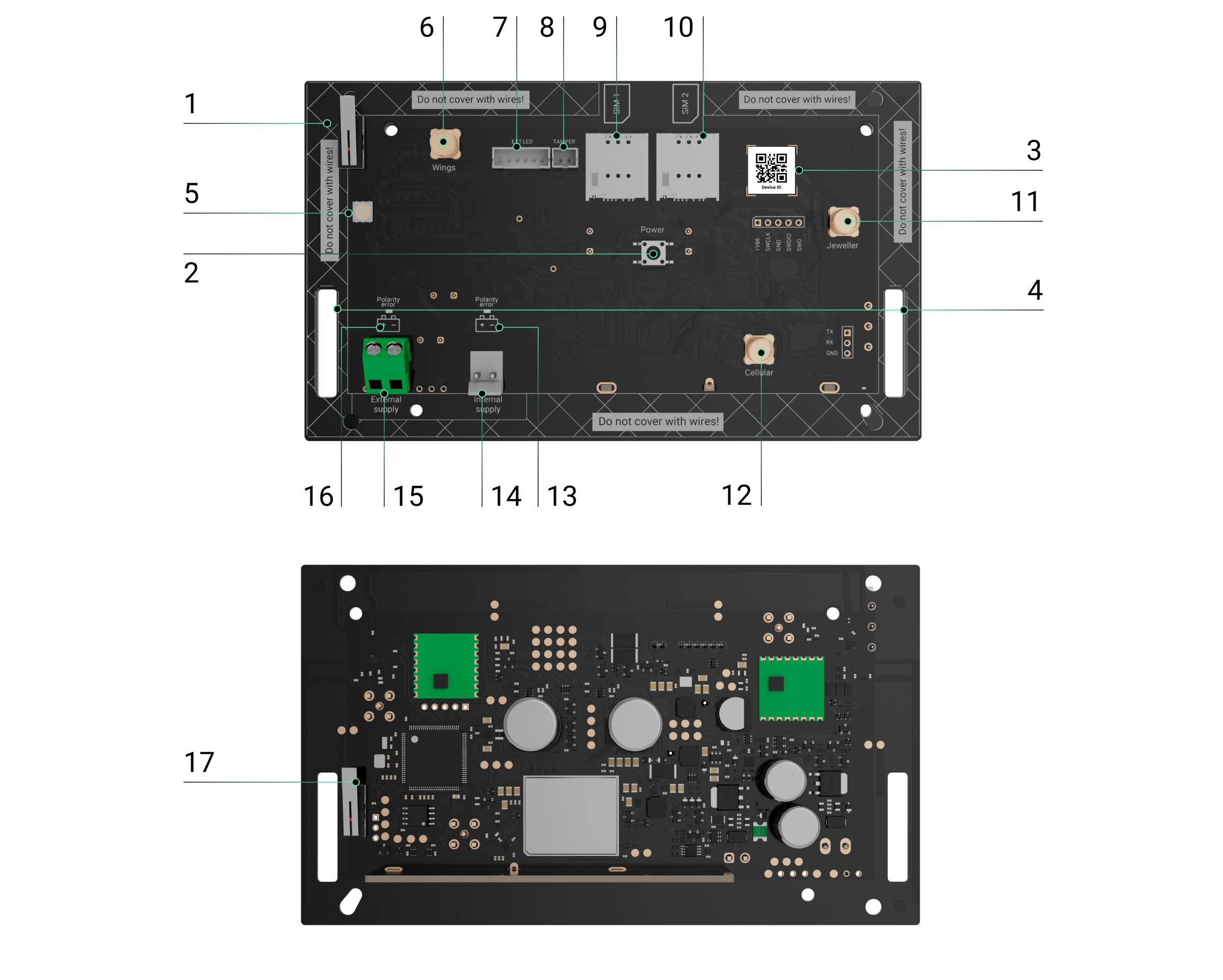- Bouton anti-sabotage côté arrière. Non utilisé dans cette version de la centrale. Dans Hub BP Jeweller, cela signale des tentatives de détacher le boîtier de la centrale de la surface.