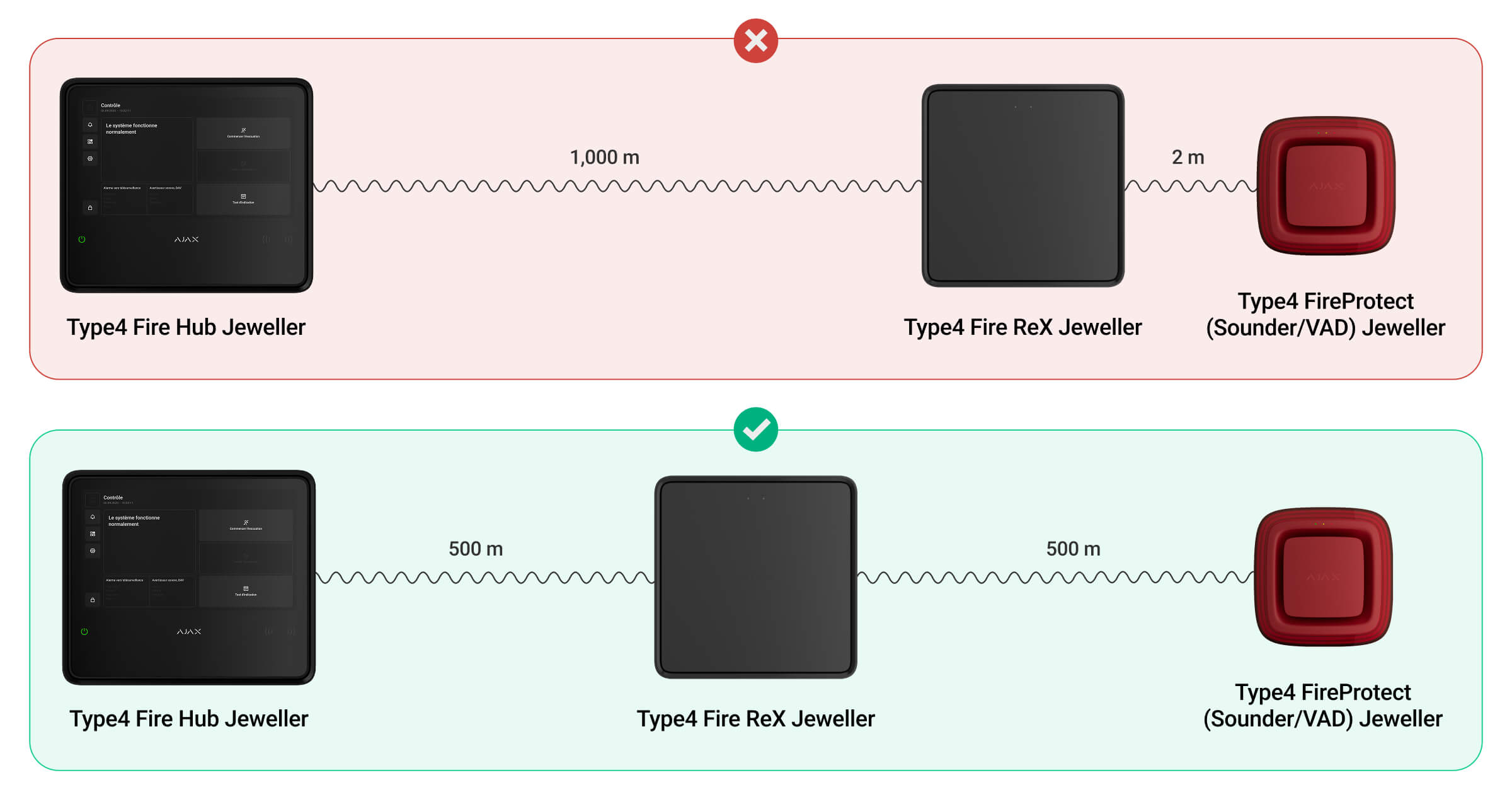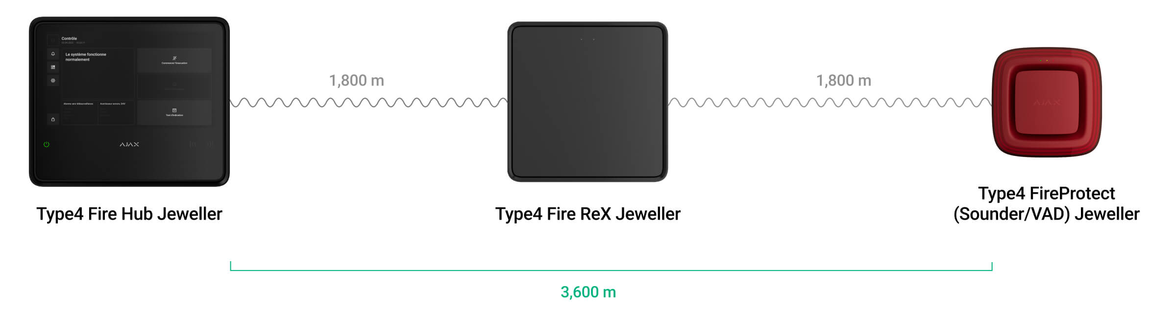 Jusqu’à cinq prolongateurs de portée peuvent être ajoutés à l’équipement d’alarme incendie. Type4 Fire ReX Jeweller ne peut être ajoutée que directement à l’équipement d’alarme incendie. La connexion à un autre prolongateur de portée n’est pas assurée.