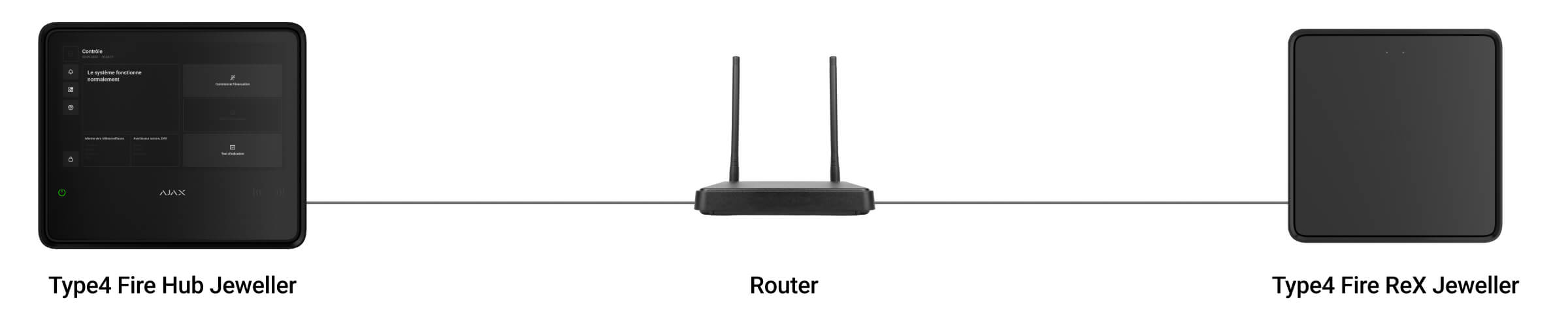 Pour communiquer via Ethernet, l’équipement d’alarme incendie et le Type4 Fire ReX Jeweller doivent être connectés au même réseau via un routeur, qui est nécessaire pour attribuer une adresse IP au prolongateur de portée. Le réseau auquel se connecte votre Type4 Fire ReX Jeweller doit autoriser les requêtes de diffusion et avoir un port 4269 ouvert pour tous les types de trafic.