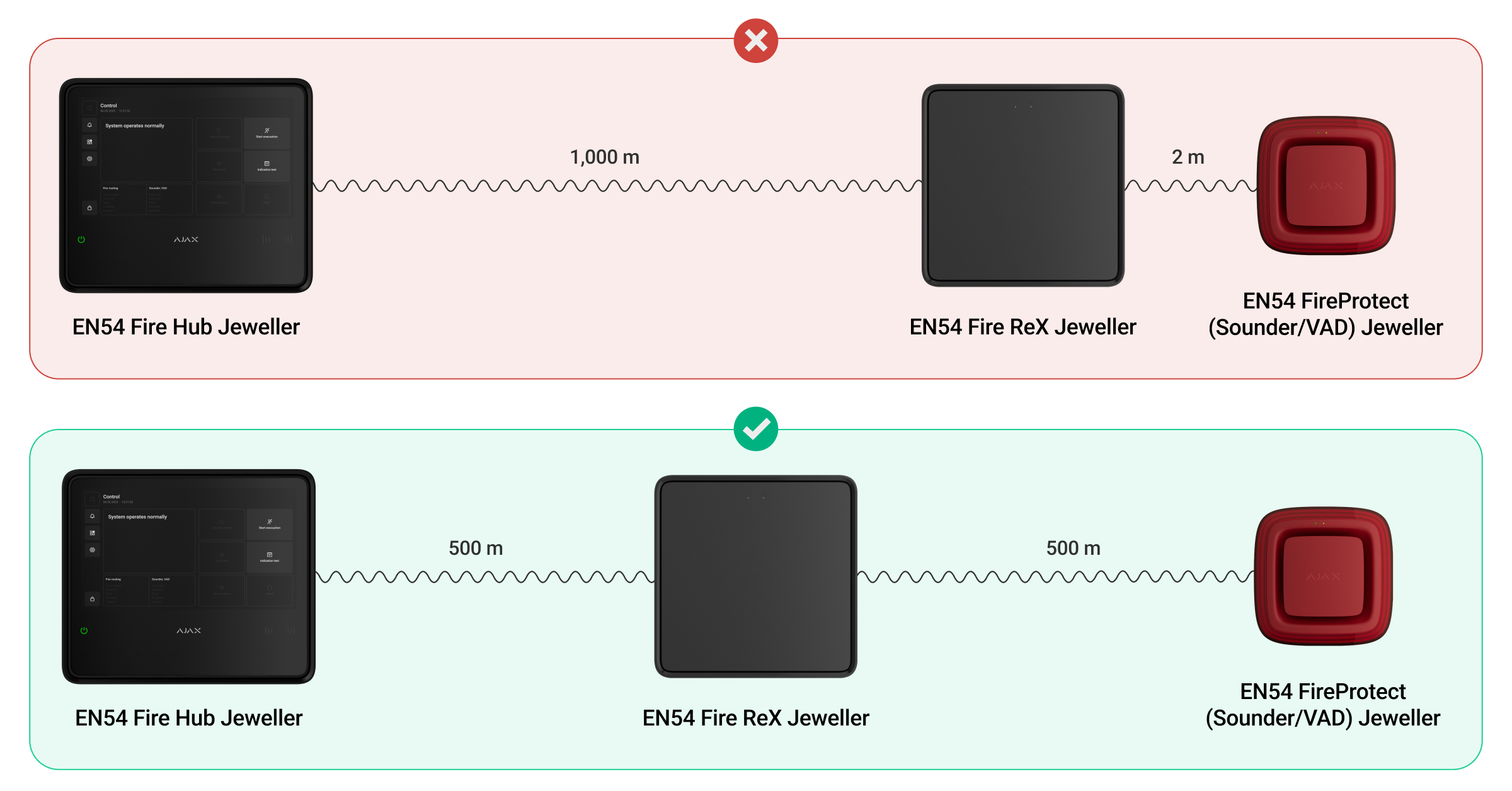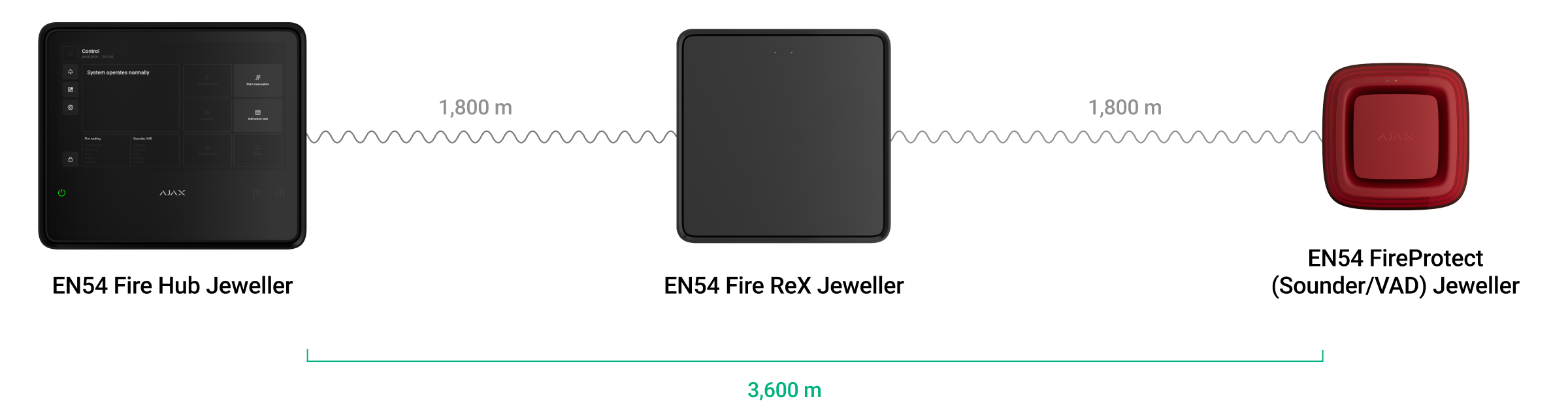 Il ripetitore comunica con la centrale antincendio wireless (CIE) tramite Ethernet e due protocolli radio sicuri: Jeweller e Wings. Il raggio di comunicazione raggiunge fino a 5.900 ft in campo aperto. Il dispositivo è progettato solo per l’installazione in ambienti interni.