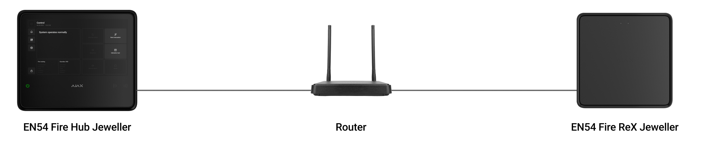 EN54 Fire ReX Jeweller supporta la connessione alla CIE tramite protocolli radio ed Ethernet. Con la connessione cablata, un singolo sistema Ajax può coprire impianti come un centro uffici con parcheggio sotterraneo, un hangar di metallo o un complesso di magazzini composto da diversi grandi edifici. Ethernet può essere l’unico canale di comunicazione o lavorare in parallelo con Jeweller e Wings. Se EN54 Fire ReX Jeweller è connesso alla CIE sia tramite Ethernet che tramite canali di comunicazione radio, la priorità viene data alla connessione Ethernet.