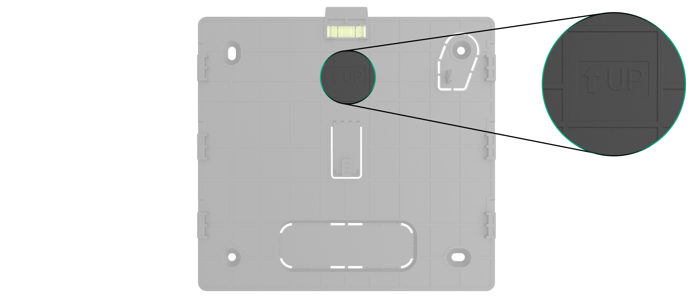 L’indicatore UP su SmartBracket indica la parte superiore del dispositivo. Utilizzare questo indicatore come guida per l’installazione del ripetitore. Utilizzare anche la livella a bolla per controllare l’angolo di inclinazione del panello durante l’installazione. - Collocare il dispositivo acceso sul pannello di montaggio SmartBracket.