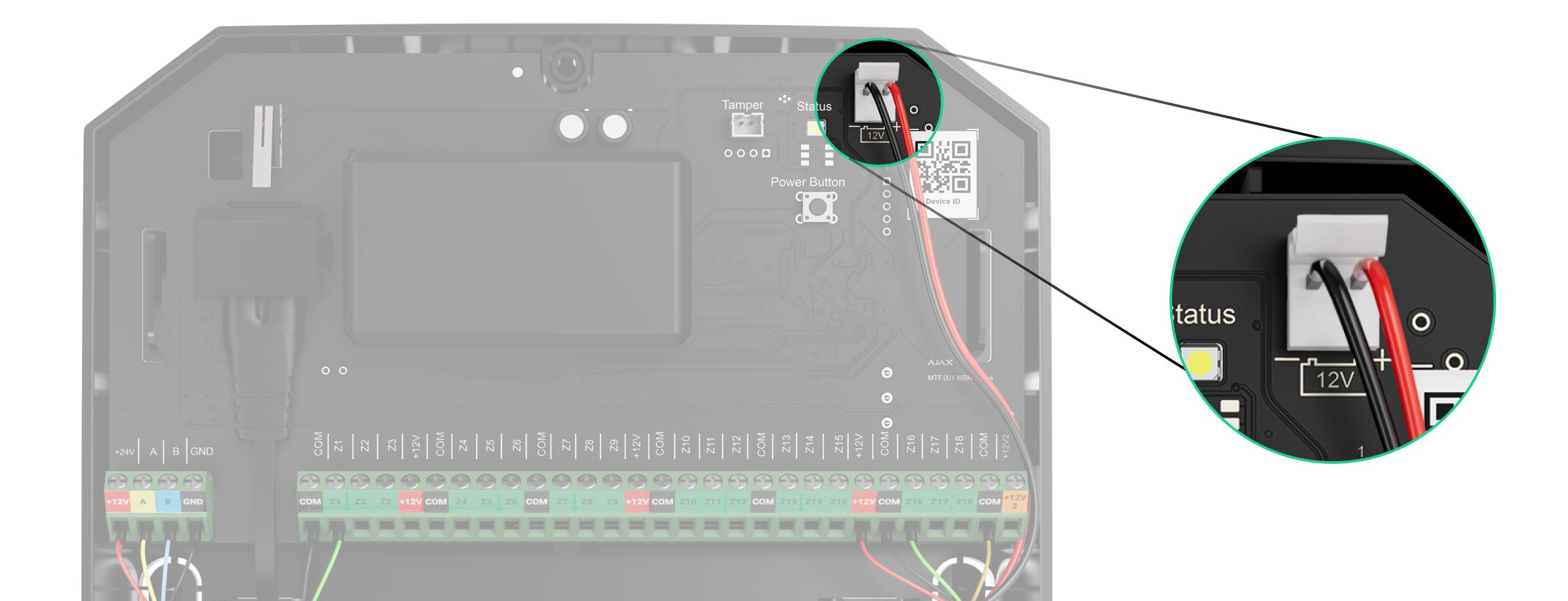 +12V2 — uscita di alimentazione per rilevatori antincendio, voltaggio 10,5–15 V⎓, fino a 0,4 A in totale per tutte le uscite di alimentazione.