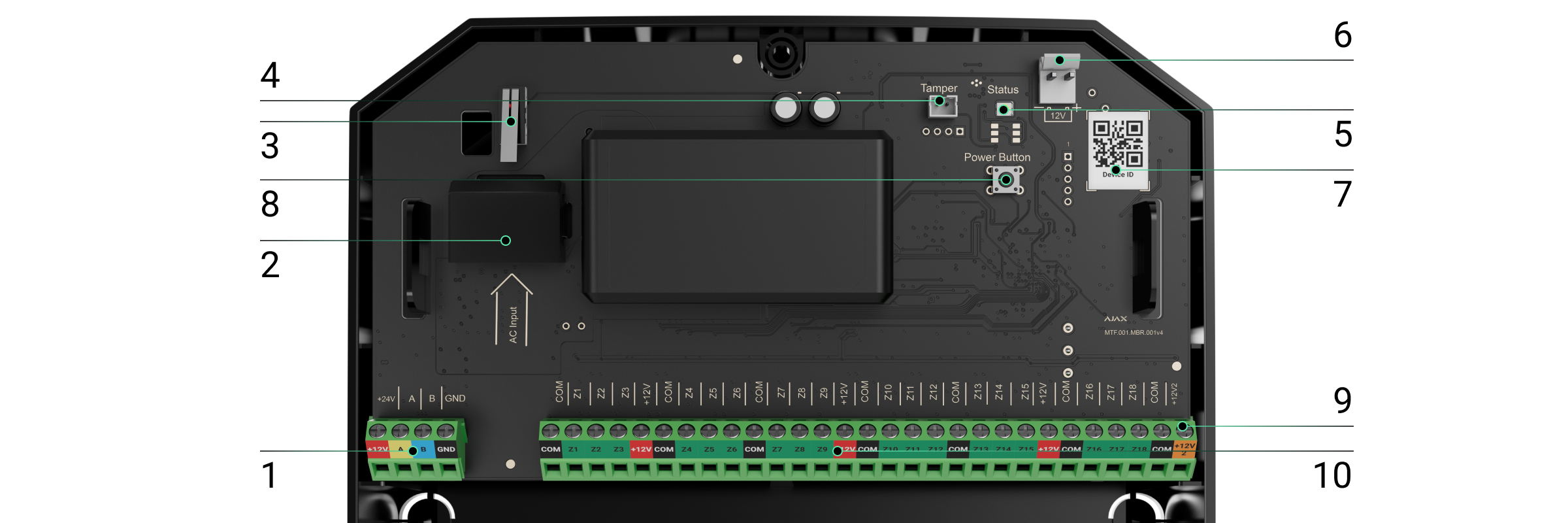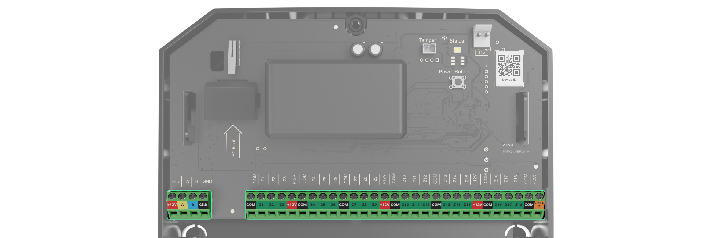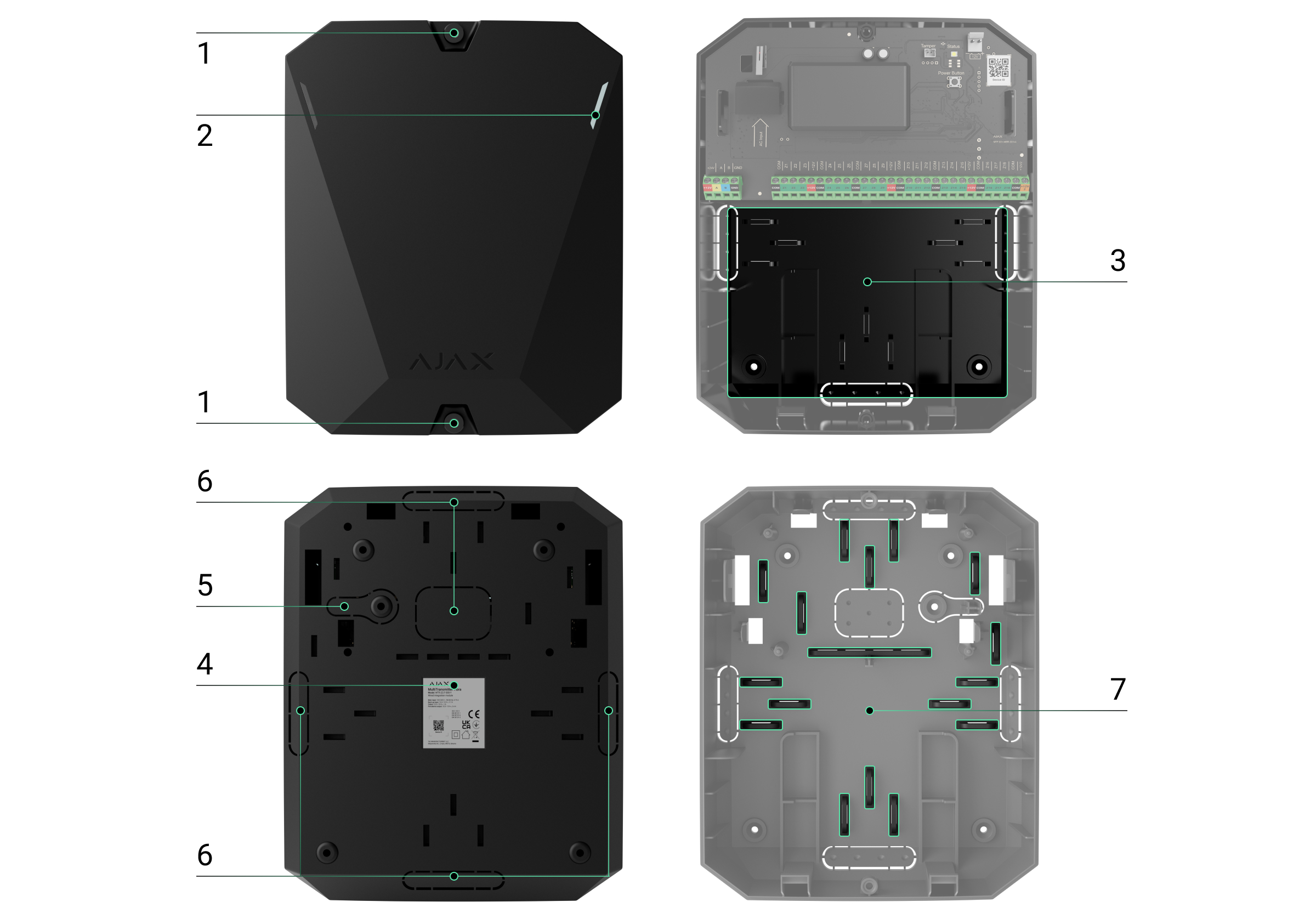 - Codice QR e ID (numero di serie) di Superior MultiTransmitter Fibra. Viene utilizzato per abbinare il dispositivo al sistema Ajax.