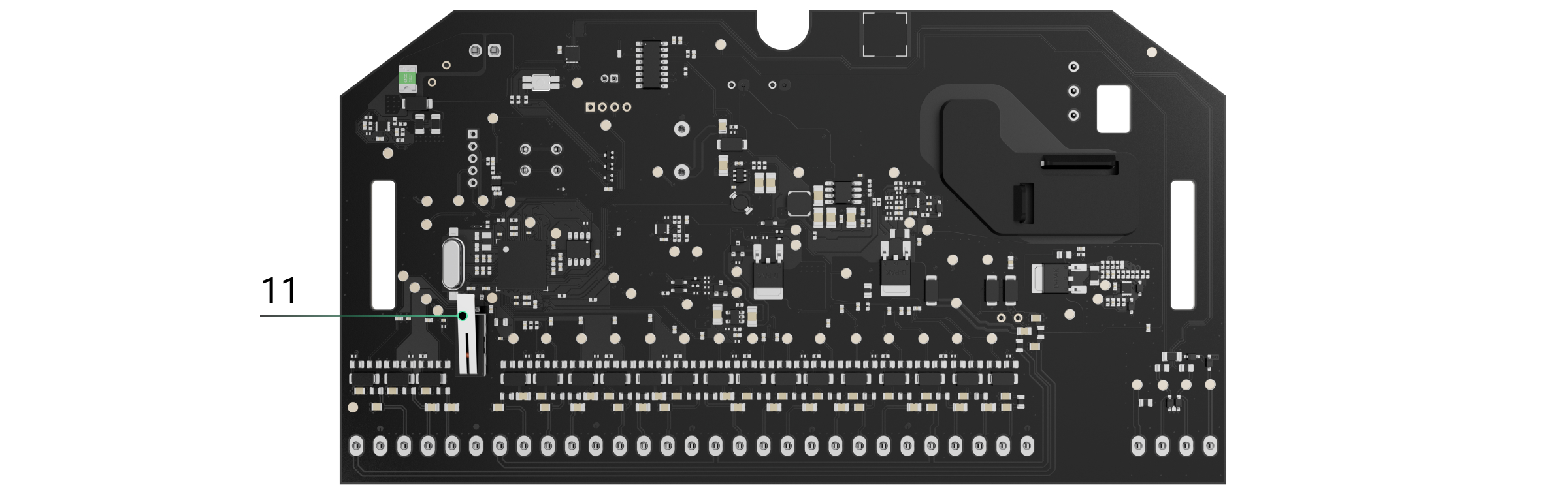 - Connettore per fissare una scheda del tamper antisabotaggio al modulo. La scheda del tamper antisabotaggio è inclusa nel set completo di Ajax Case (la custodia è venduta separatamente).