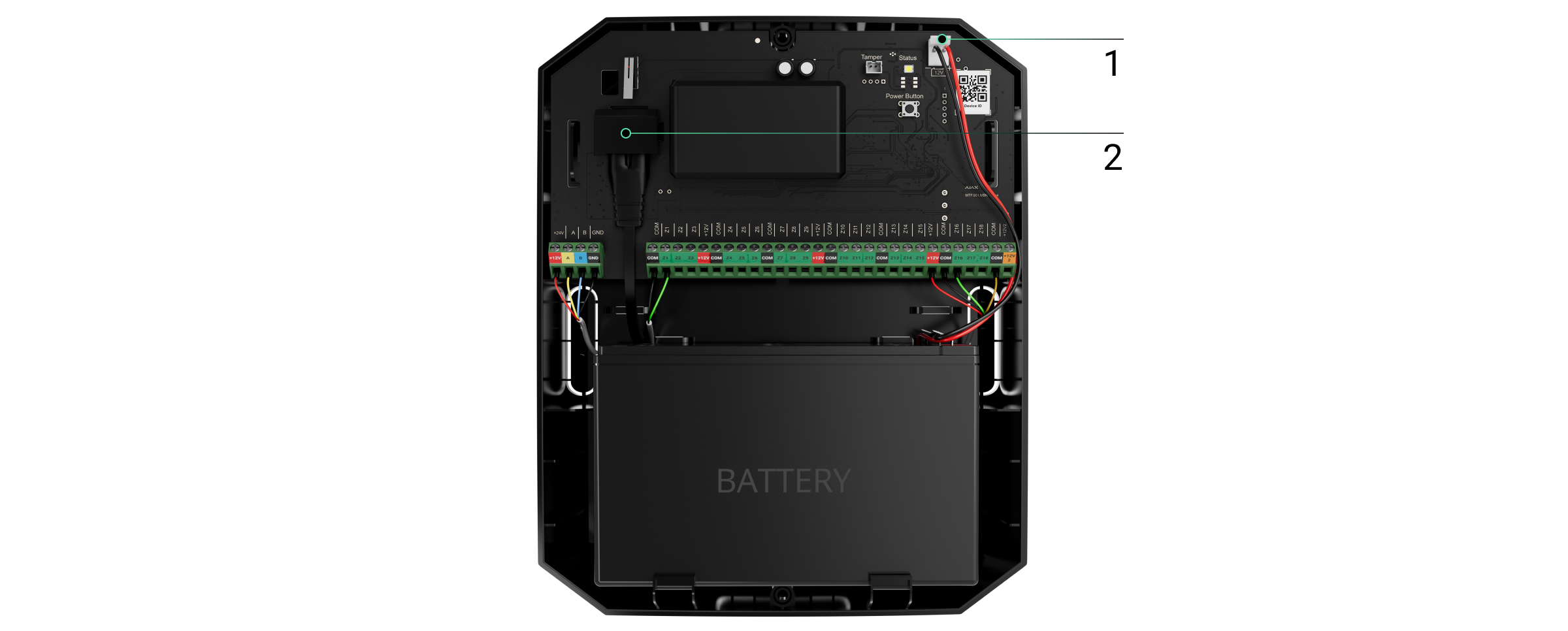 +12V — uscita di alimentazione per dispositivi cablati, voltaggio 10,5–15 V⎓, fino a 1 A in totale per tutte le uscite di alimentazione.