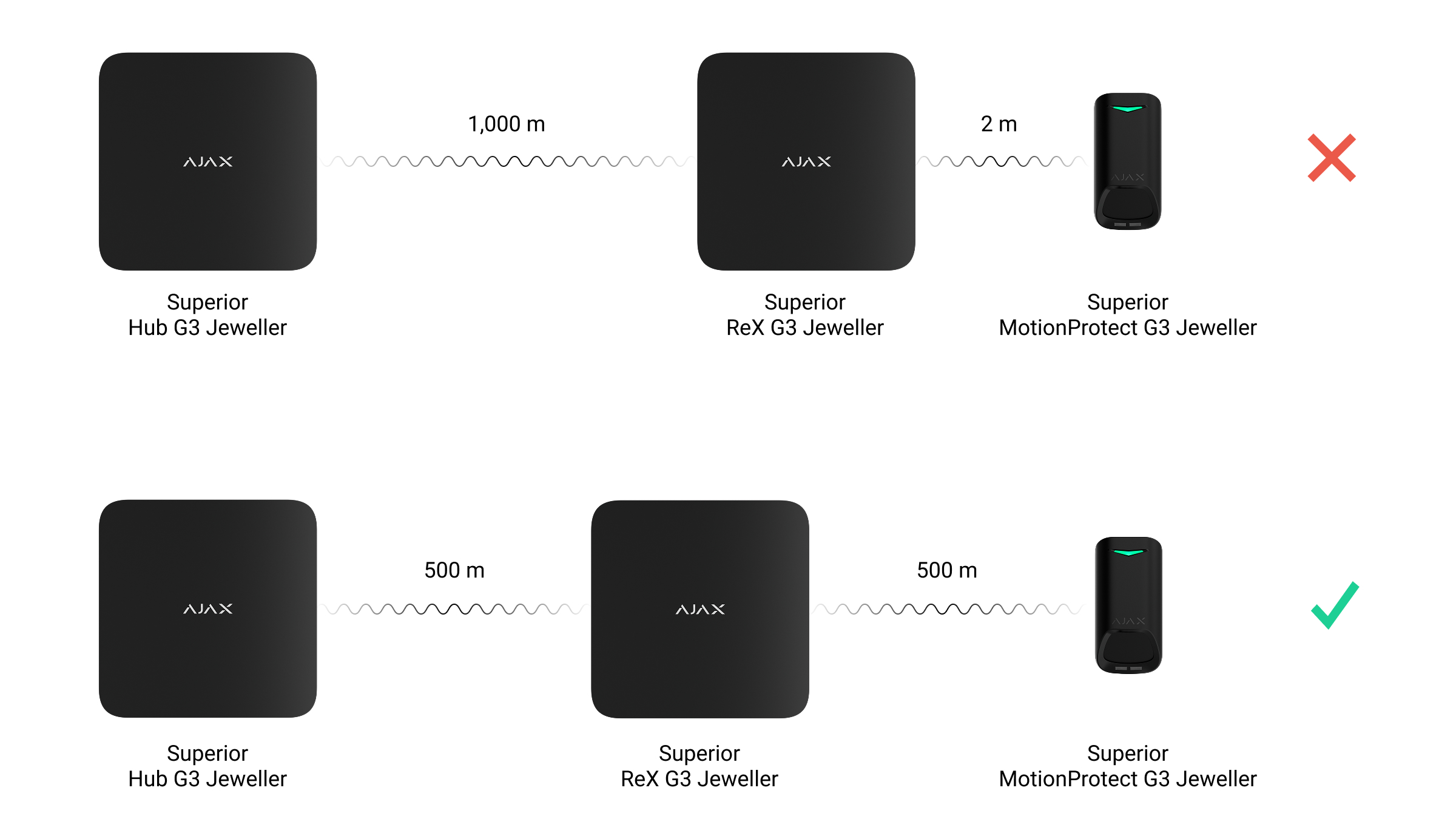 Superior ReX G3 Jeweller dovrebbe essere posizionato tra l’hub e un dispositivo con un segnale debole. Il ripetitore non amplifica il segnale radio, quindi installarlo vicino all’hub o a un dispositivo con un livello di segnale di 1 o 0 barre non produrrà il risultato desiderato. Il nostro Calcolatore della portata della comunicazione radio vi aiuterà a calcolare approssimativamente il livello del segnale nel luogo di installazione.