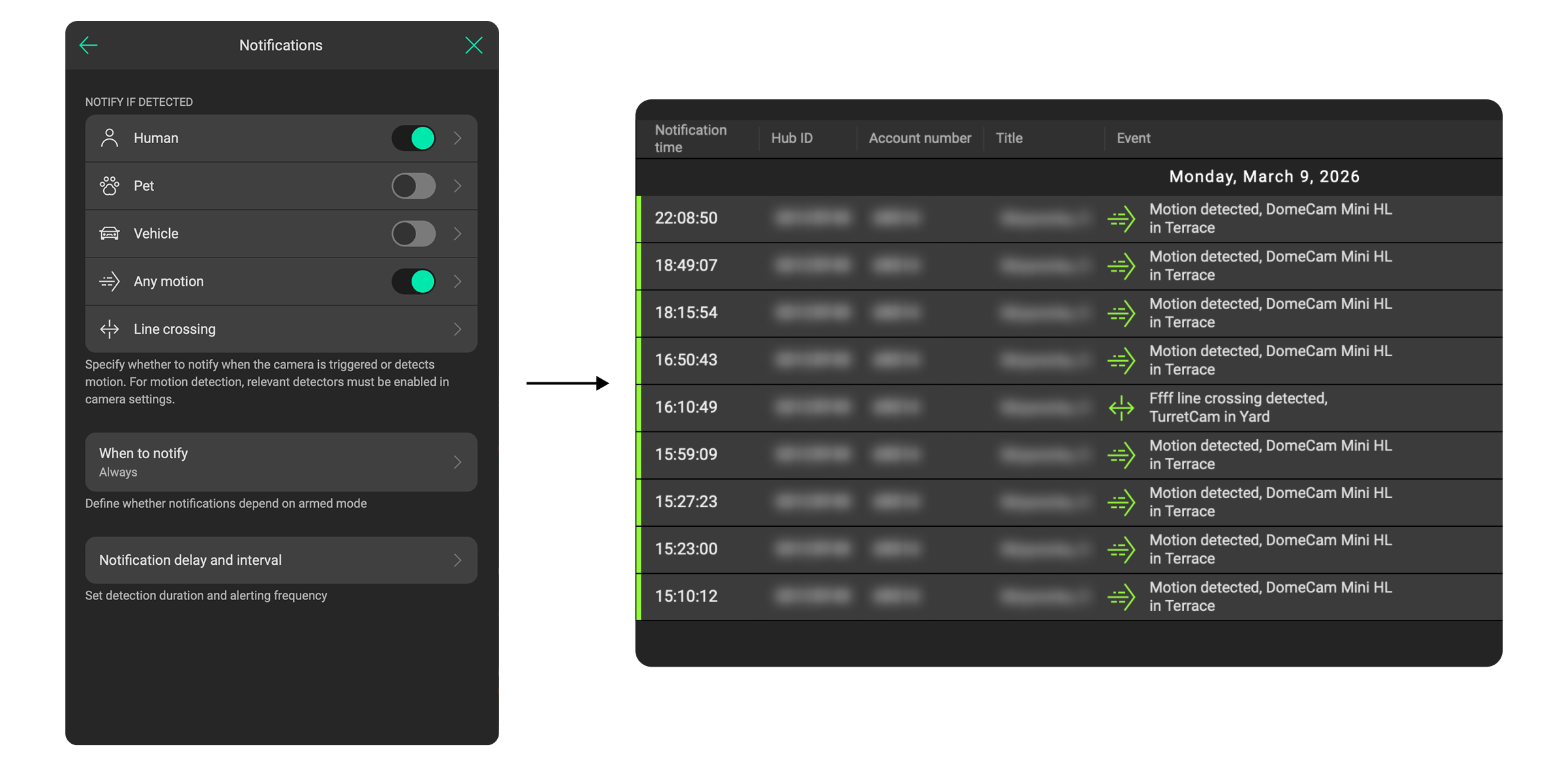 - Selecteer het type object of beweging dat een melding moet activeren. Houd er rekening mee dat de overeenkomstige typen objecten of bewegingen moeten worden ingeschakeld in de instellingen voor Detectie.