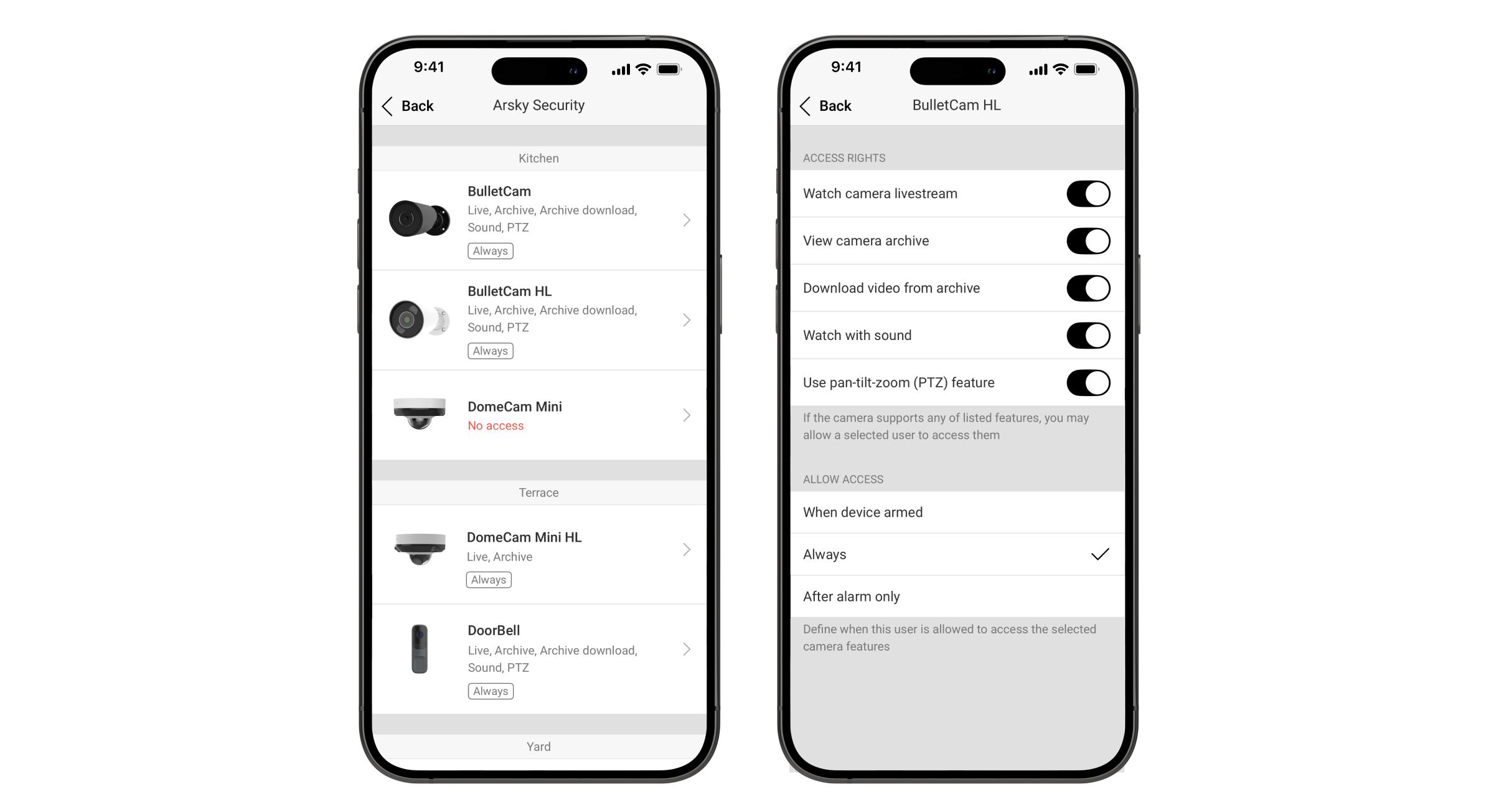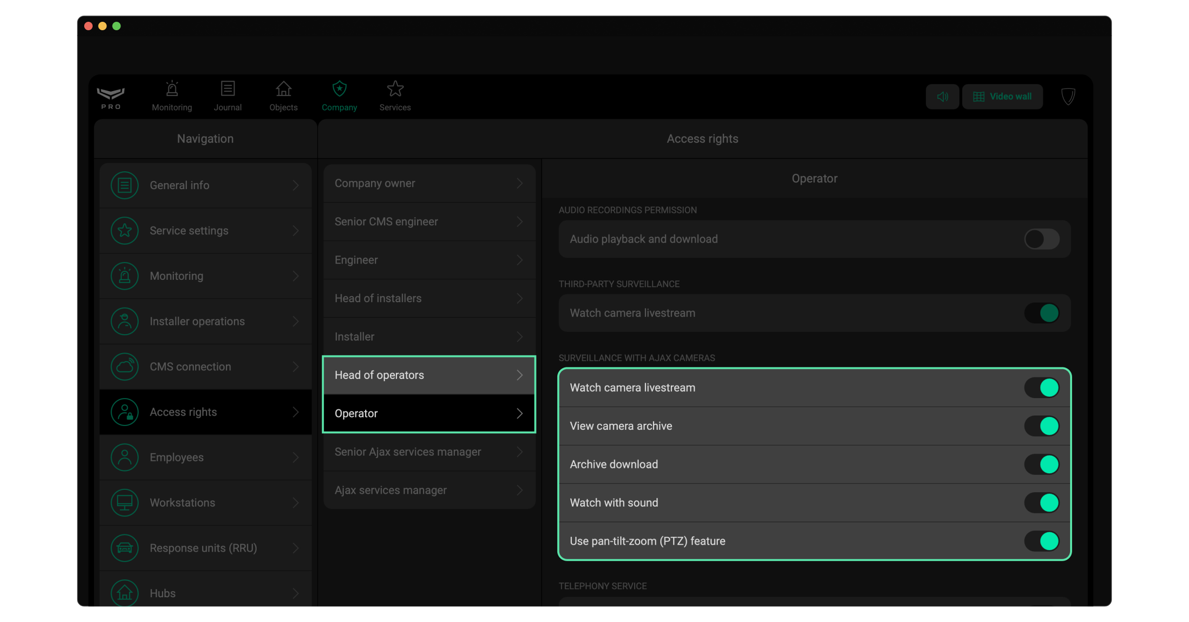 - Controleer de toegangsrechten voor de Hoofdoperator en Operator. Zorg ervoor dat de opties in Bewaking met Ajax-camera’s zijn ingeschakeld.