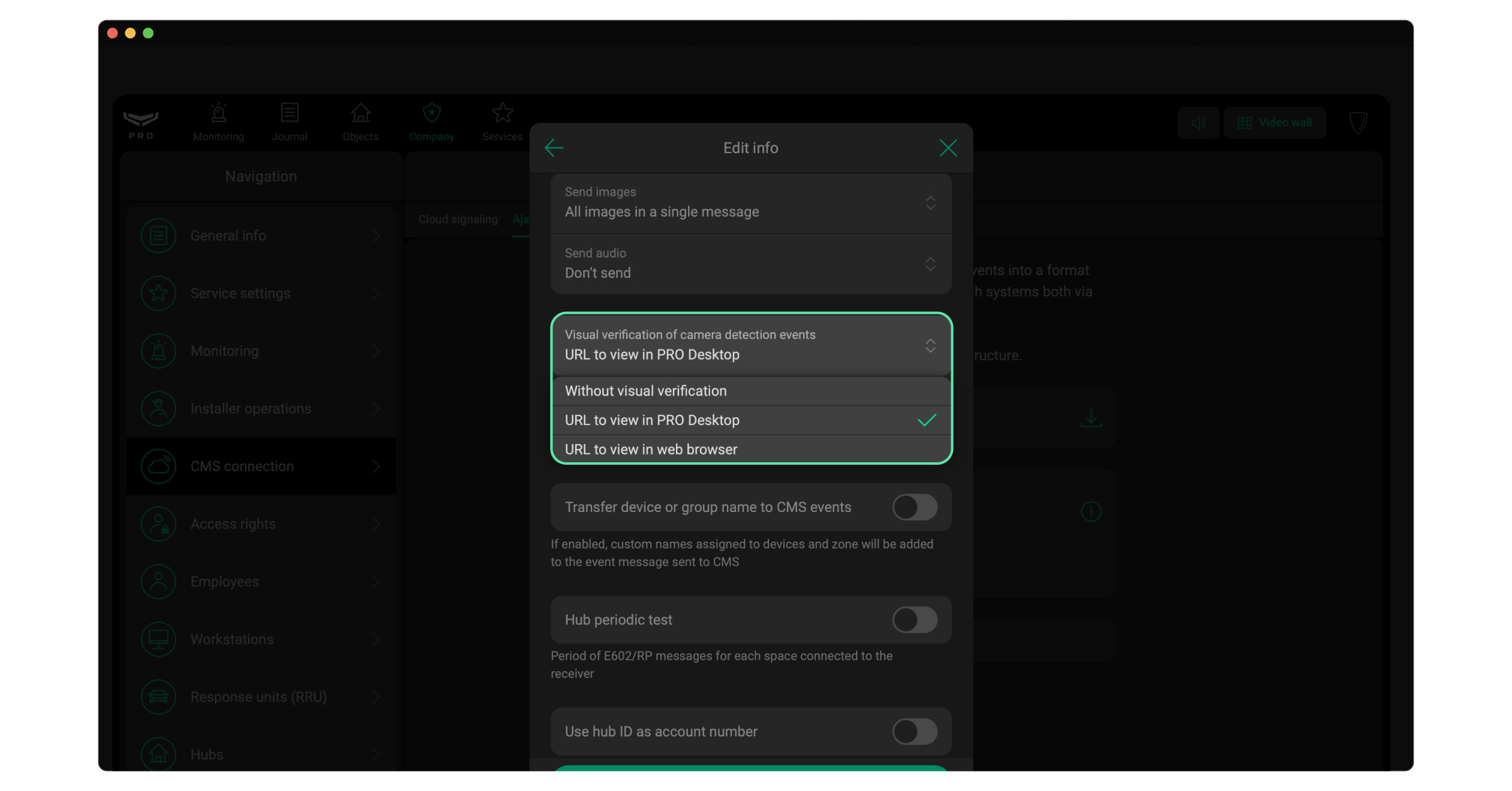 - Stel de instellingen voor Visuele verificatie van detectie door camera in: URL voor weergave in PRO Desktop of URL voor weergave in webbrowser.