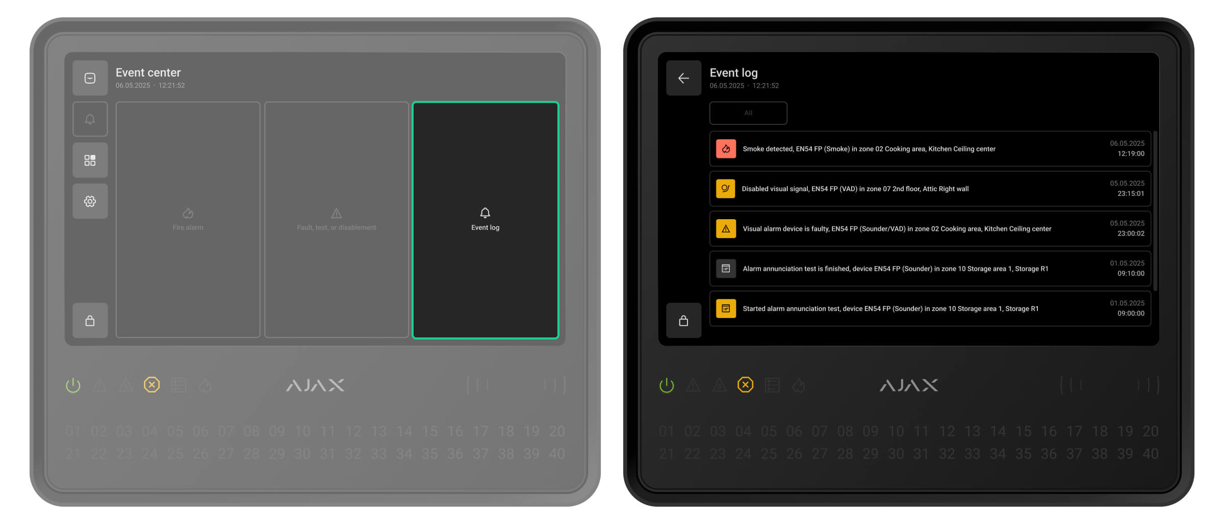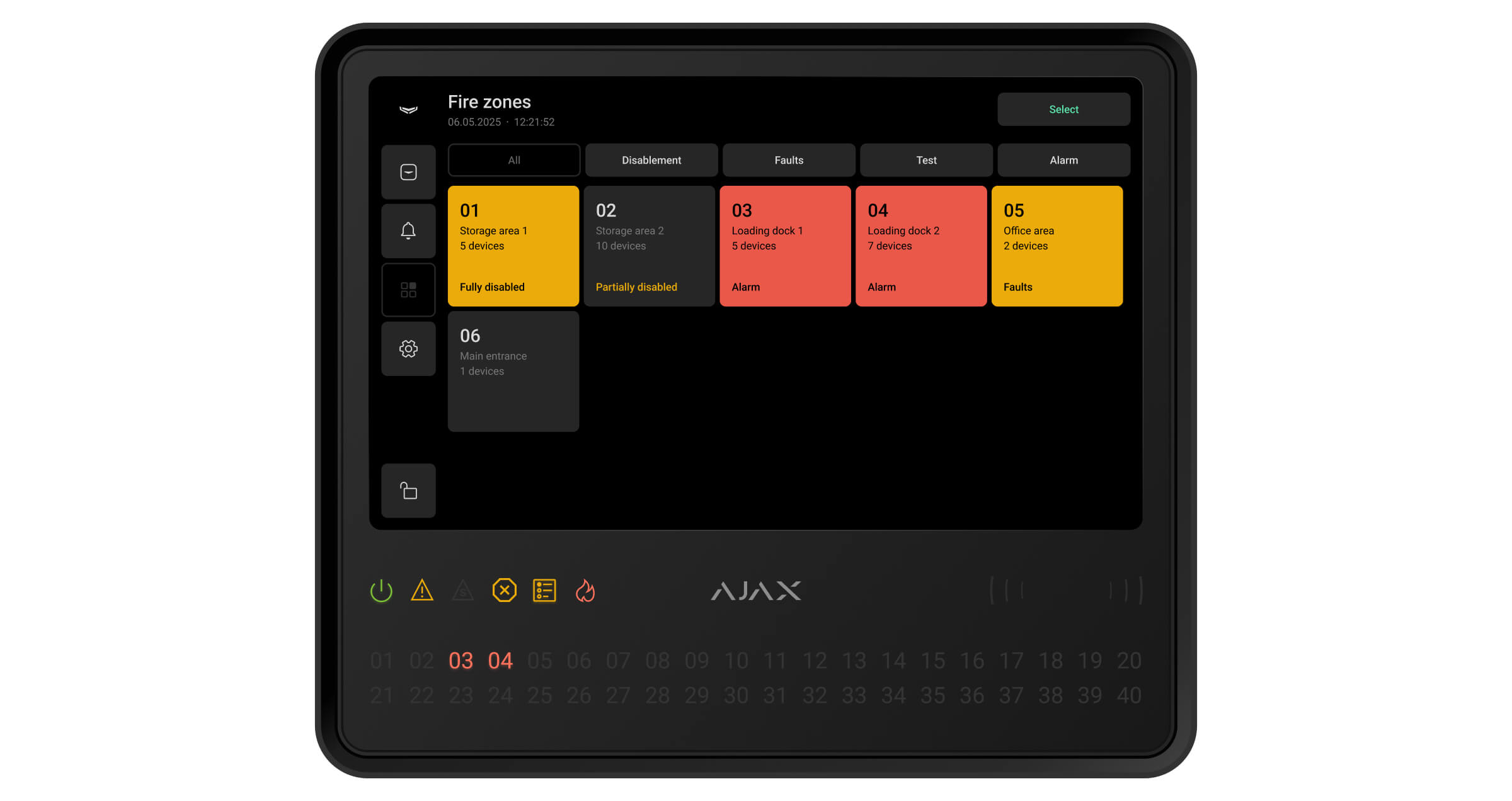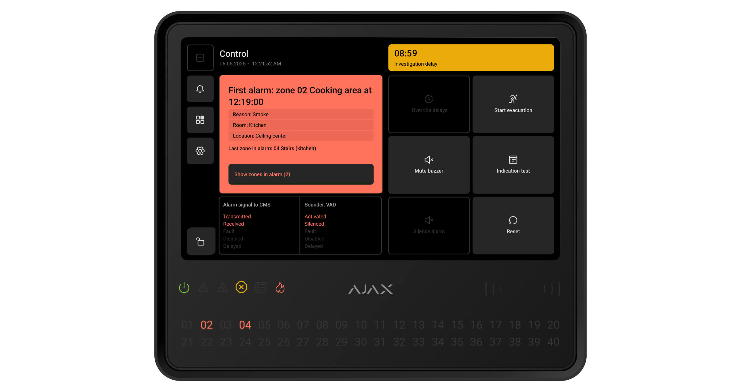 Ajax-apparaten van de EN54-lijn die zijn verbonden met de CIE worden toegewezen aan een van de 40 brandzones. Wanneer er een brand wordt gedetecteerd in een zone of een Ajax-handbrandmelder wordt ingedrukt, geven alle Ajax EN54-sirenes en flitslichten (VAD’s) in het systeem een alarm af.