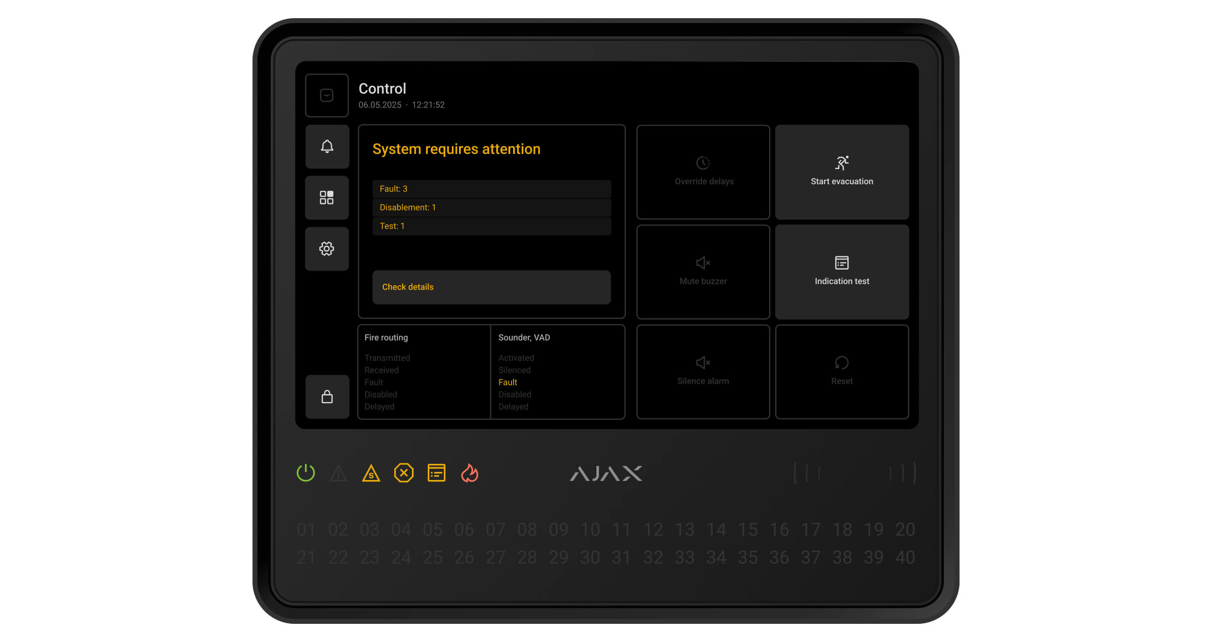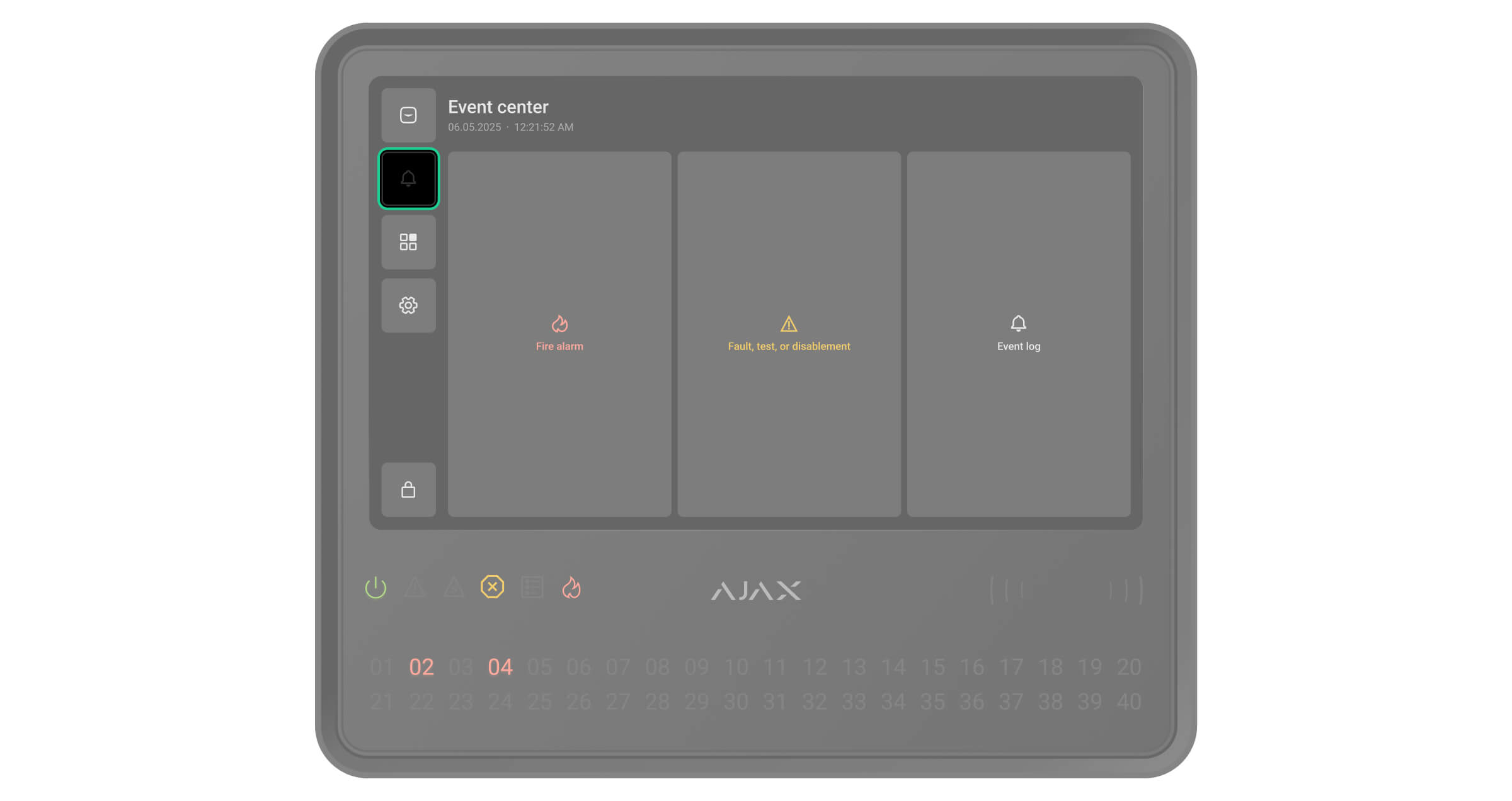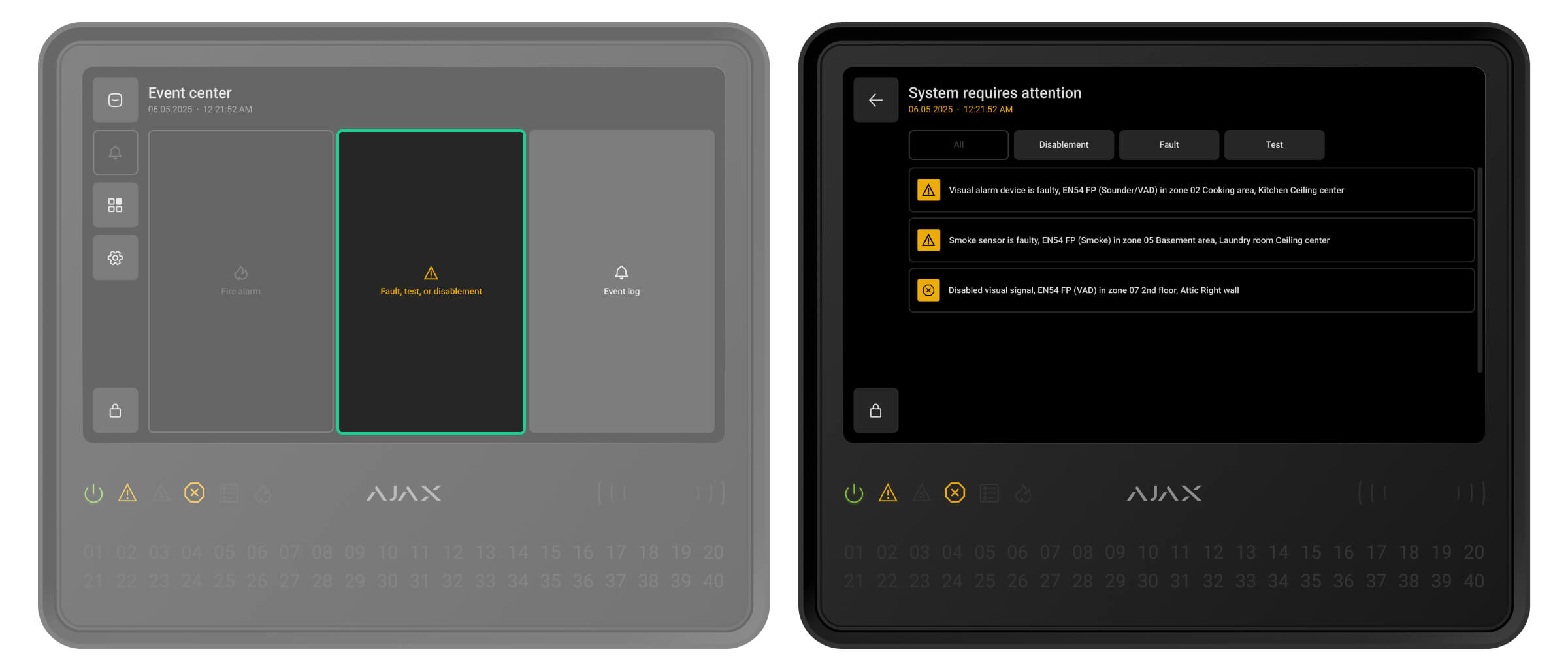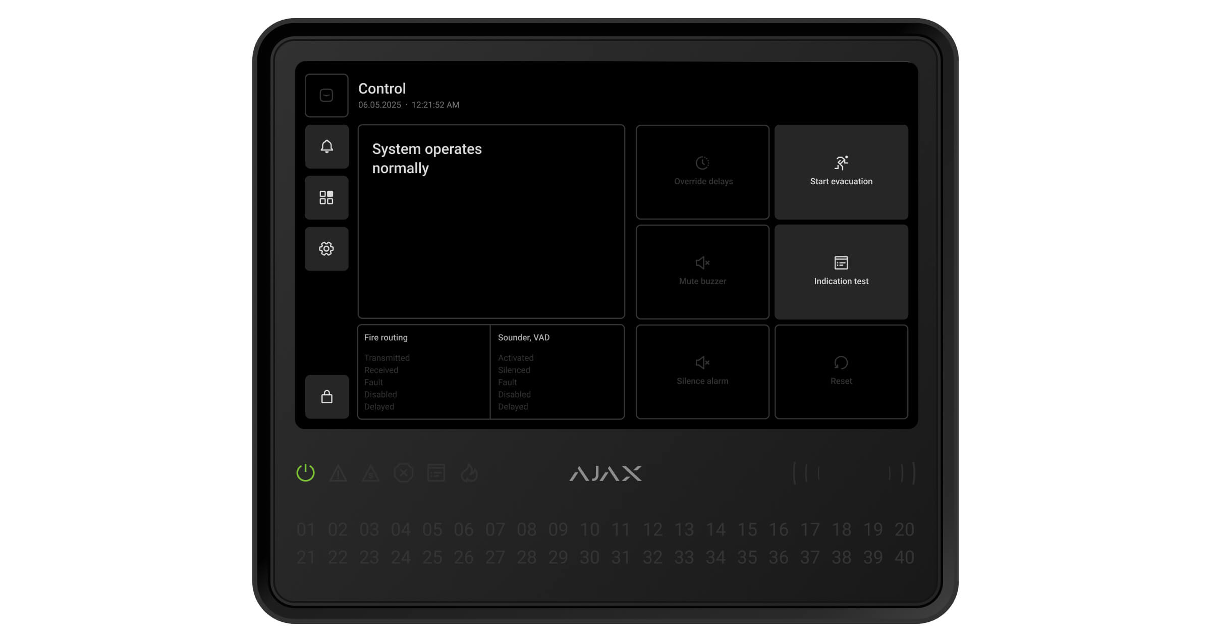 Ajax-apparaten van de EN54-lijn die zijn verbonden met de CIE worden toegewezen aan een van de 40 brandzones. Wanneer er een brand wordt gedetecteerd in een zone of een Ajax-handbrandmelder wordt ingedrukt, geven alle Ajax EN54-sirenes en flitslichten (VAD’s) in het systeem een alarm af.