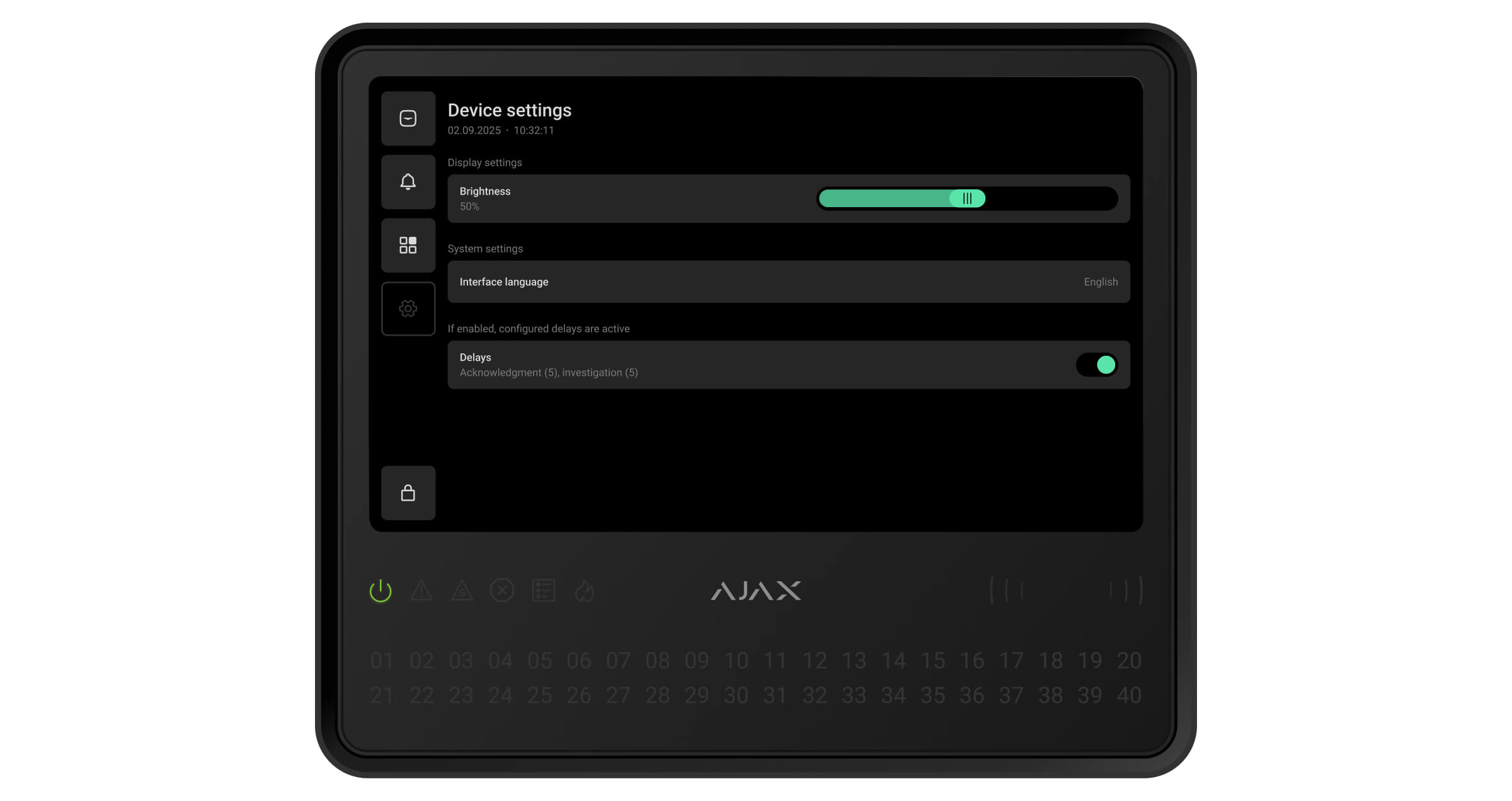 Via het tabblad Instellingen op het scherm van EN54 Fire Hub Jeweller kunnen gebruikers de helderheid van de achtergrondverlichting van het scherm aanpassen en de interfacetaal selecteren. Deze opties zijn beschikbaar voor alle gebruikers.