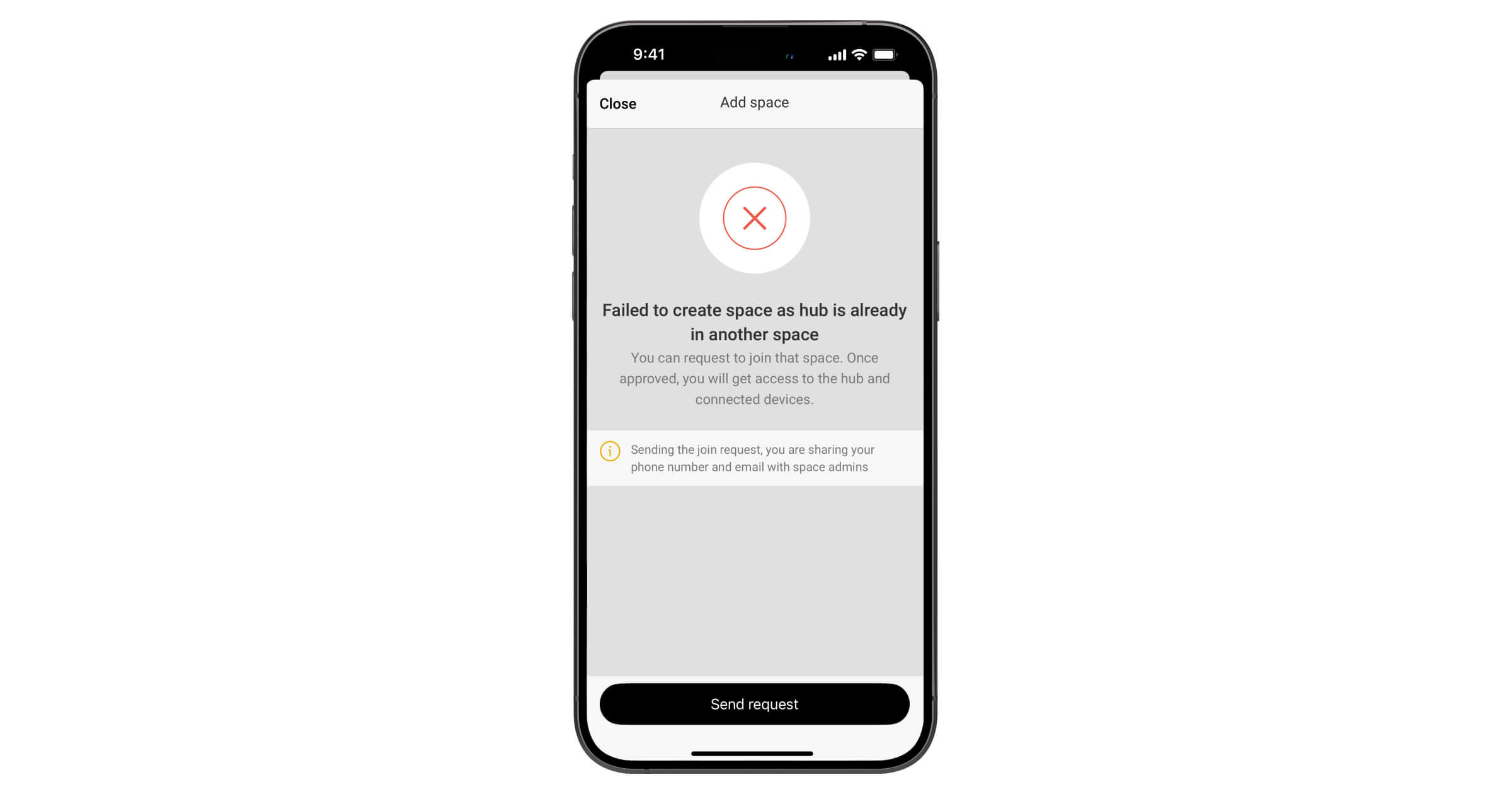 Als u probeert een CIE toe te voegen die al tot een andere space behoort en een beheerder heeft, een PRO-gebruiker met volledige rechten of een bedrijf, zal het systeem u vragen een verzoek te sturen om het toe te voegen aan de huidige beheerders.