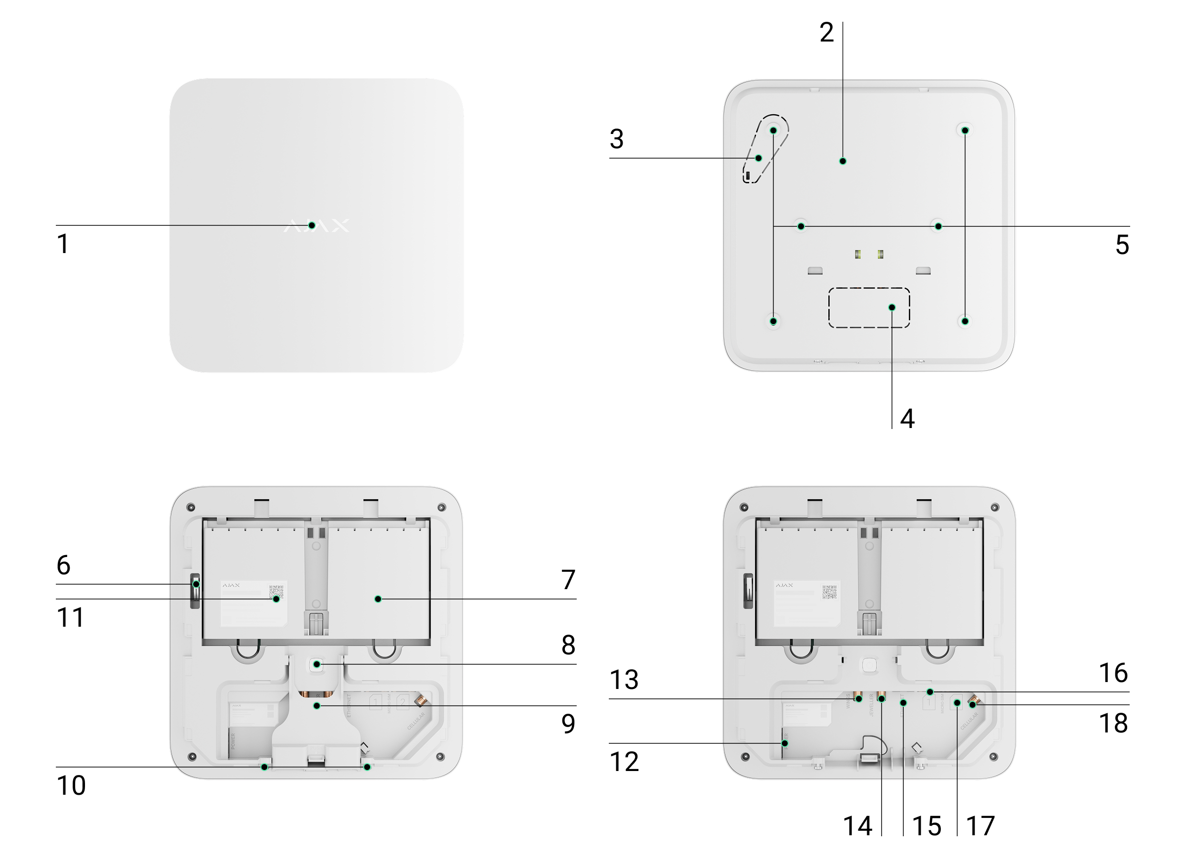 Superior Hub G3 Jeweller is een draadloos bedieningspaneel voor een Ajax-systeem met ondersteuning voor fotoverificatie. De hub maakt verbinding met de Ajax Cloud-server via ethernet, twee simkaarten (2G/LTE) en wifi. De hub heeft een aansluiting voor een externe antenne voor mobiele, Jeweller- en Wings-communicatiekanalen.