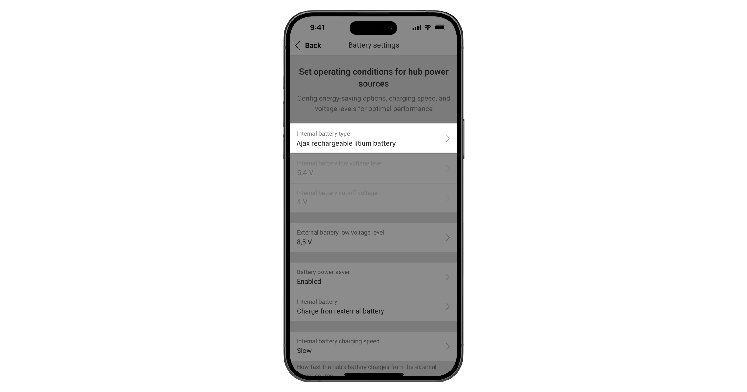 Po zainstalowaniu baterii należy wybrać odpowiednie ustawienia huba w aplikacji Ajax PRO.