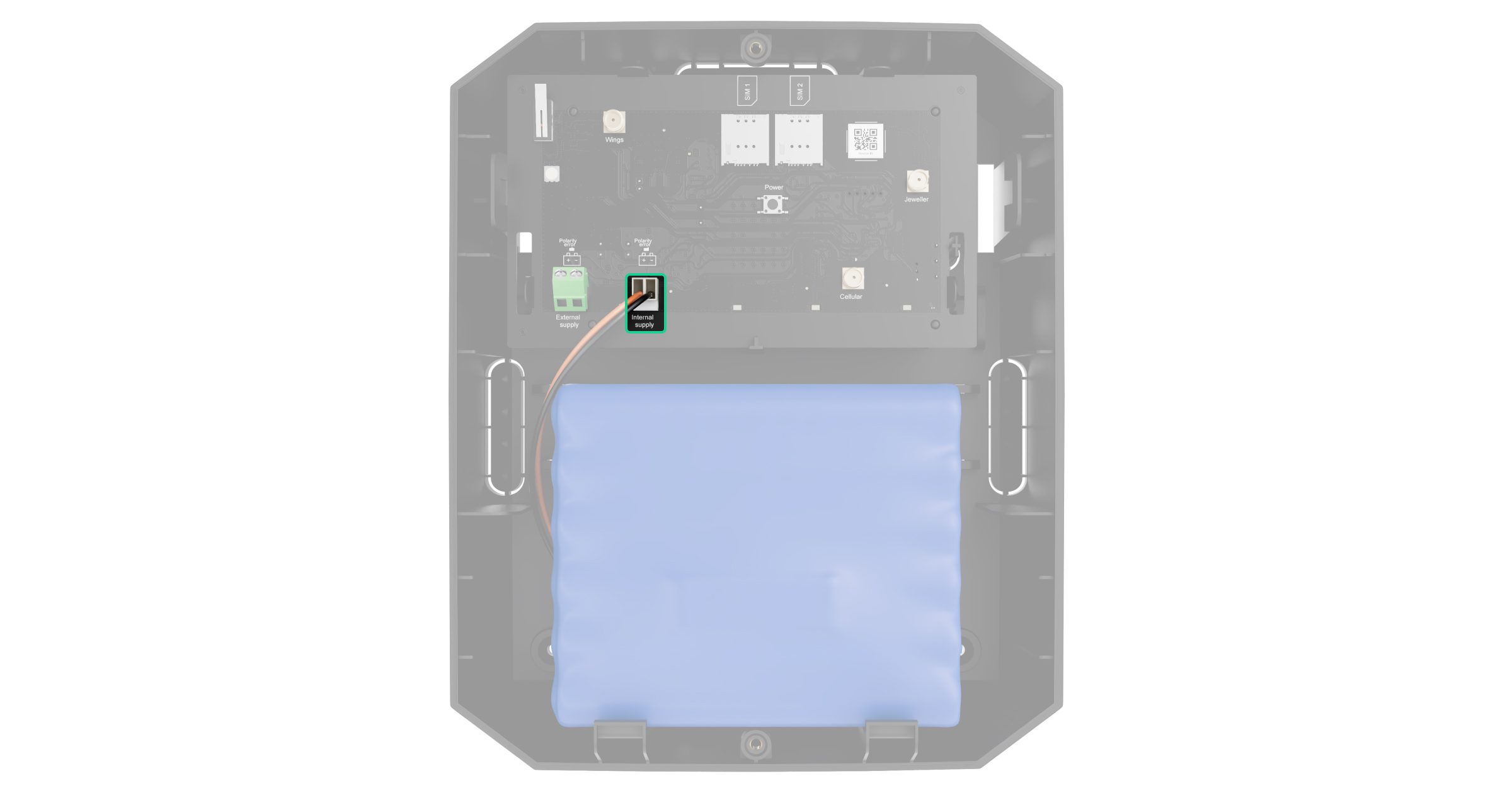 - Zlokalizuj złącze wewnętrznej baterii na płytce (Internal supply).