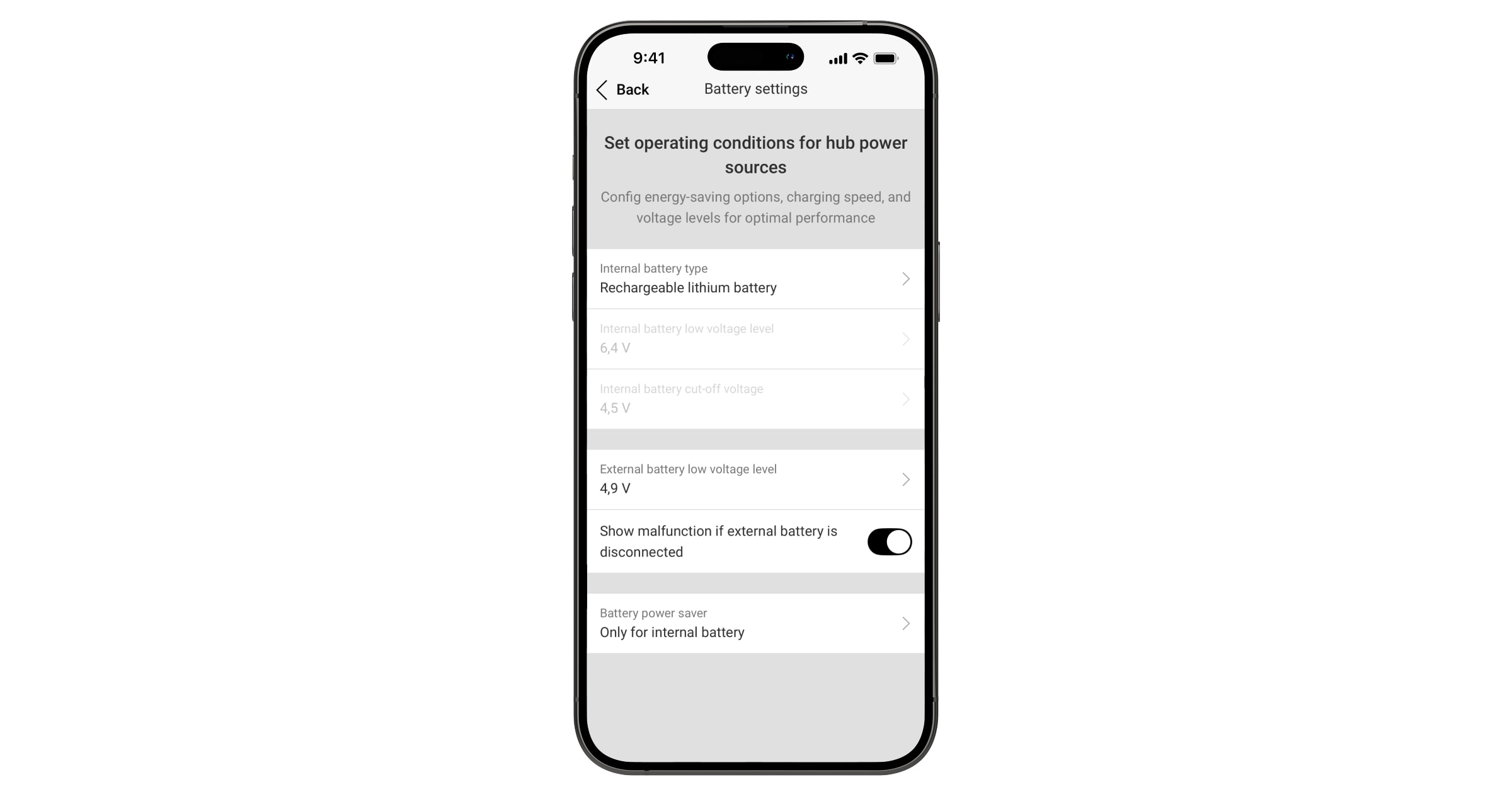 - Wybierz typ baterii w ustawieniach huba.