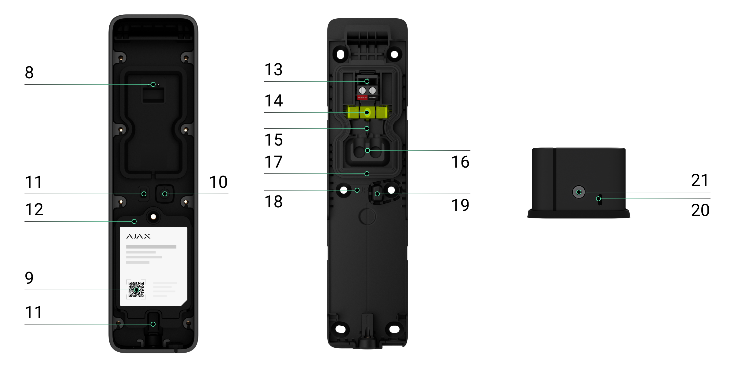 - Logo Ajax, przycisk OK i podświetlenie ze wskaźnikiem LED;