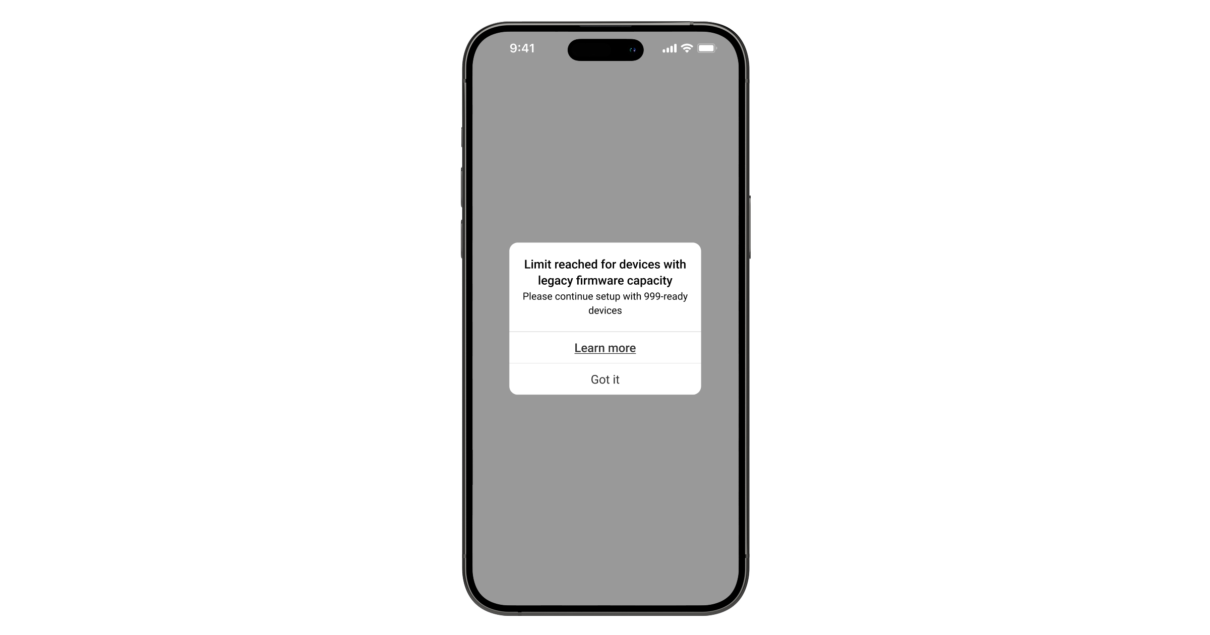 Urządzenia wyprodukowane wcześniej, które nie mają na opakowaniu etykiety „999 ready” i obsługują funkcję DFU, umożliwiają zdalne pobranie i instalację zaktualizowanego oprogramowania sprzętowego. Po zainstalowaniu zaktualizowanego oprogramowania sprzętowego możesz dodać do huba do 999 urządzeń bez ograniczeń.