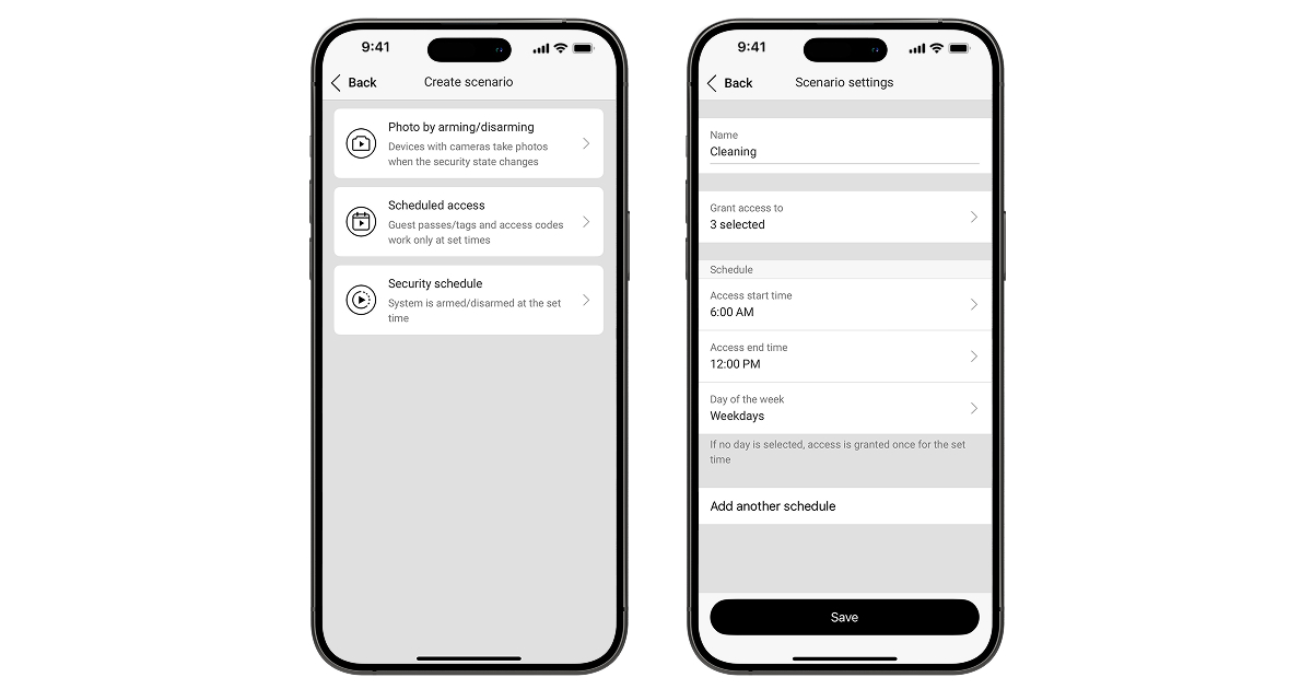 Используйте сценарии, чтобы автоматизировать безопасность и сократить количество рутинных действий. Например, настройте перекрытие воды по тревоге датчика протечки LeaksProtect Jeweller, включение обогревателя при низкой температуре или автоматическое закрытие электрозамка при постановке под охрану.