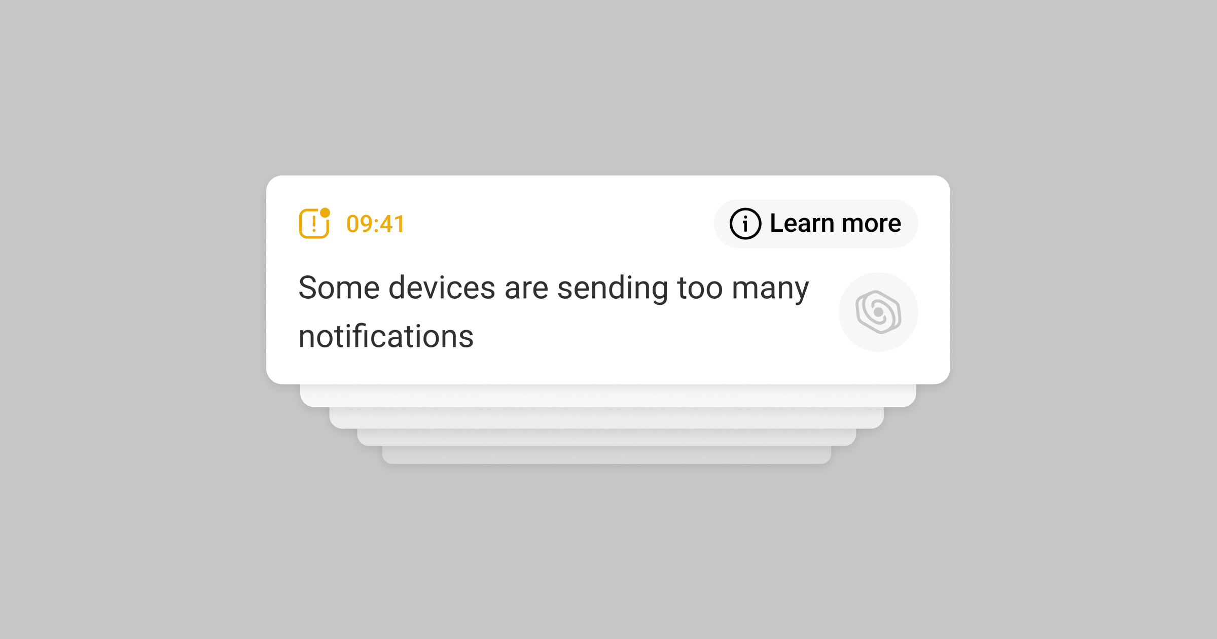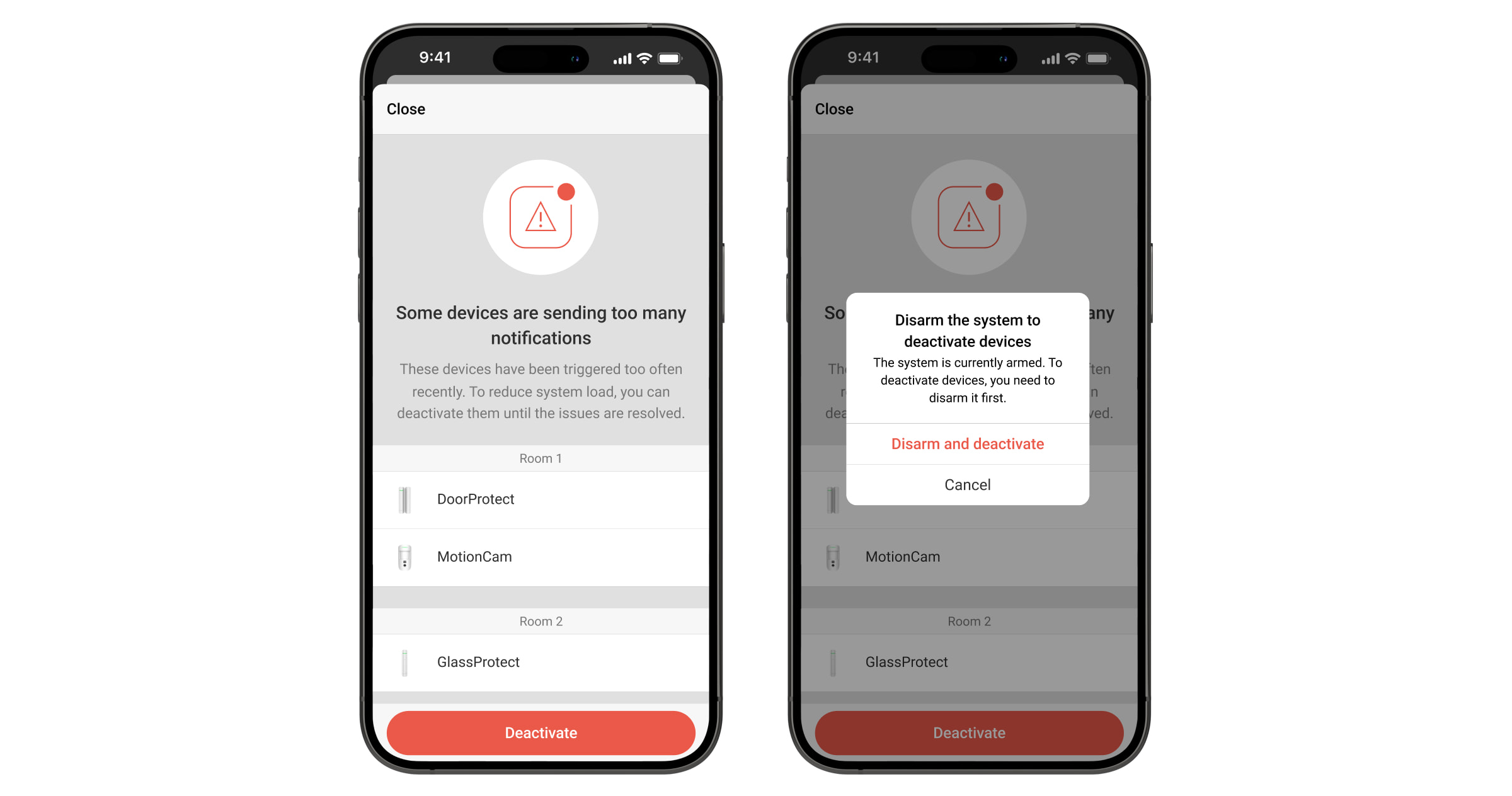 Ajax uygulamaları, bir cihazın kısa bir süre içinde aşırı sayıda alarm olayı göndermesi gibi anormal cihaz davranışları hakkında kullanıcıları bilgilendirir. Bu, kurulum sorunlarını veya cihaz arızalarını tespit etmeye yardımcı olur ve sistem yükünü azaltır.