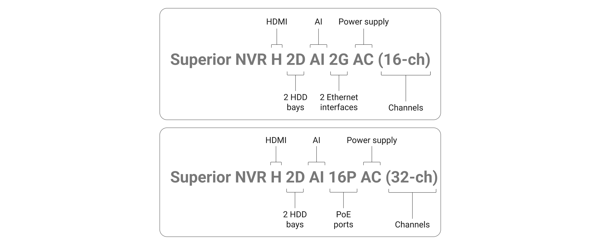Örneğin Superior NVR H2DAI16PAC (32-ch); HDMI çıkışı, 2 HDD, 16 PoE çıkışı, alternatif akım desteği, 32 kanal ve yapay zeka özelliklerine sahiptir.