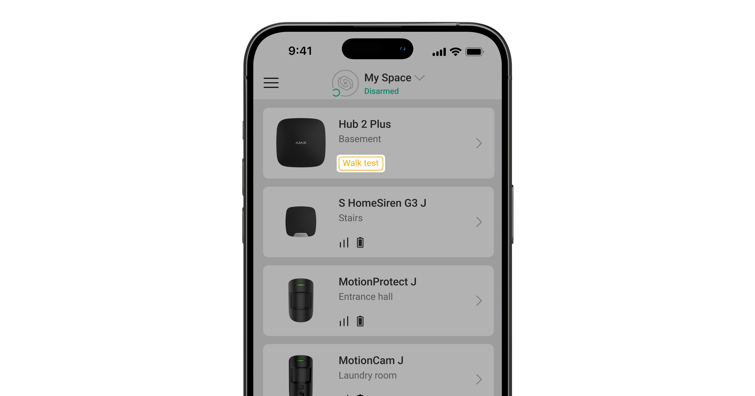 Hub (2G) Jeweller dışında OS Malevich 2.35 ve üzeri bir sürümünü çalıştıran tüm Ajax hub’ları Yürüme testi modunu destekler.