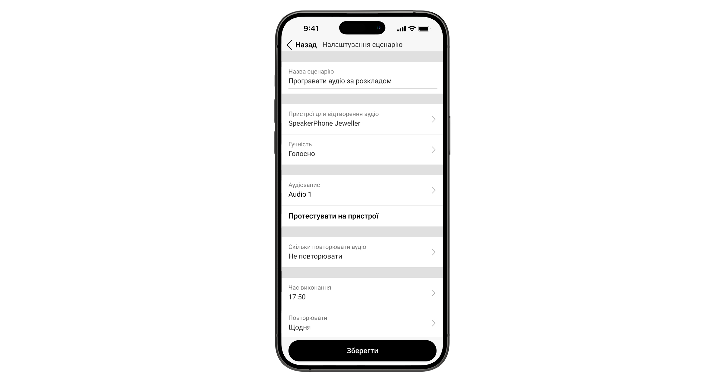 Аудіосценарій дає змогу голосовим модулям автоматично відтворювати власні аудіозаписи за тривогою, за розкладом або в разі зміни режиму охорони.