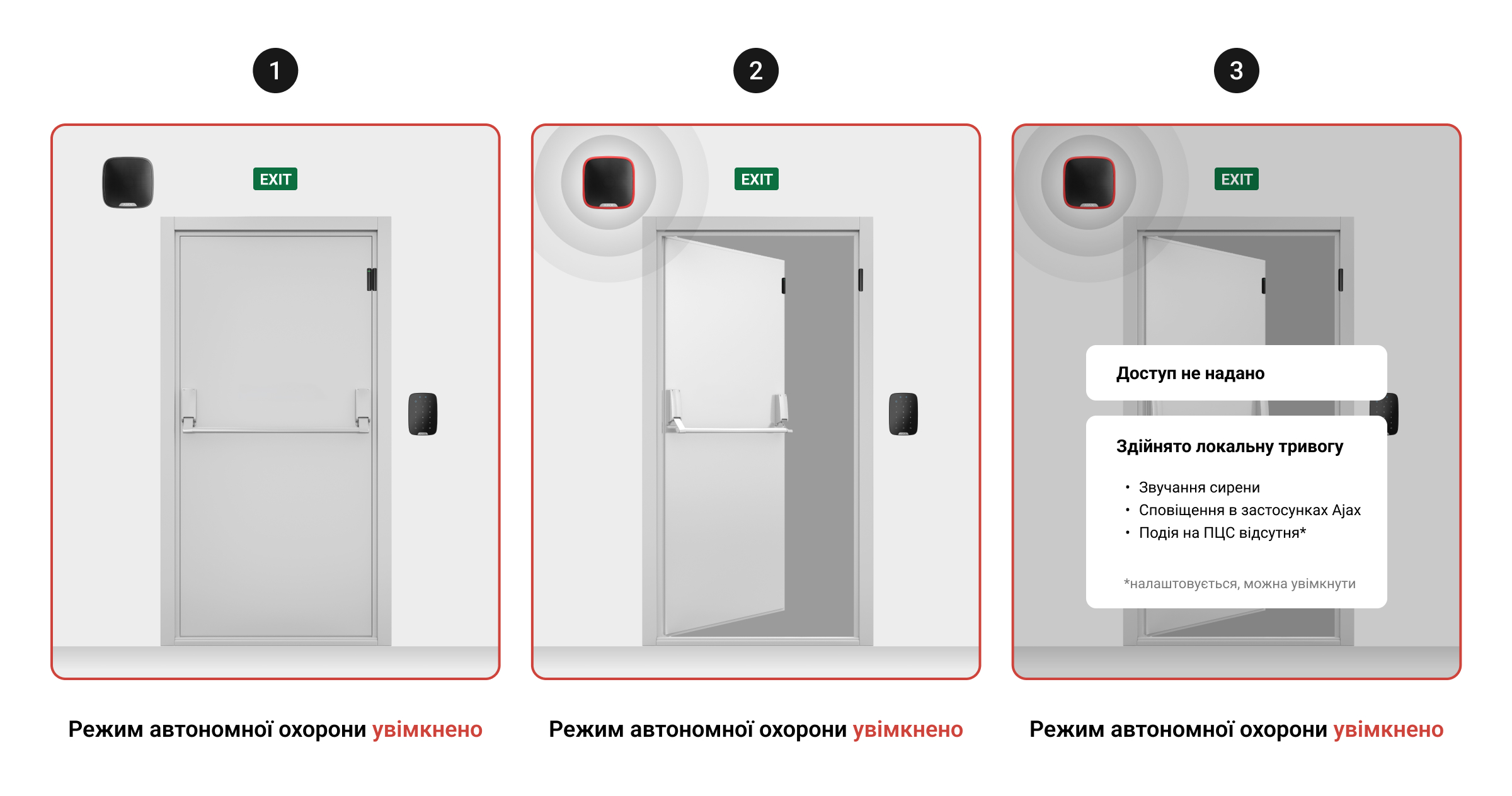 Якщо хтось сторонній проникне в зону, захищену режимом автономної охорони, здійметься локальна тривога. Система надішле сповіщення в застосунки Ajax і активує сирени, але не надішле тривогу на пульт централізованого спостереження (ПЦС). Однак надсилання тривоги на ПЦС можна ввімкнути за необхідності в налаштуваннях.